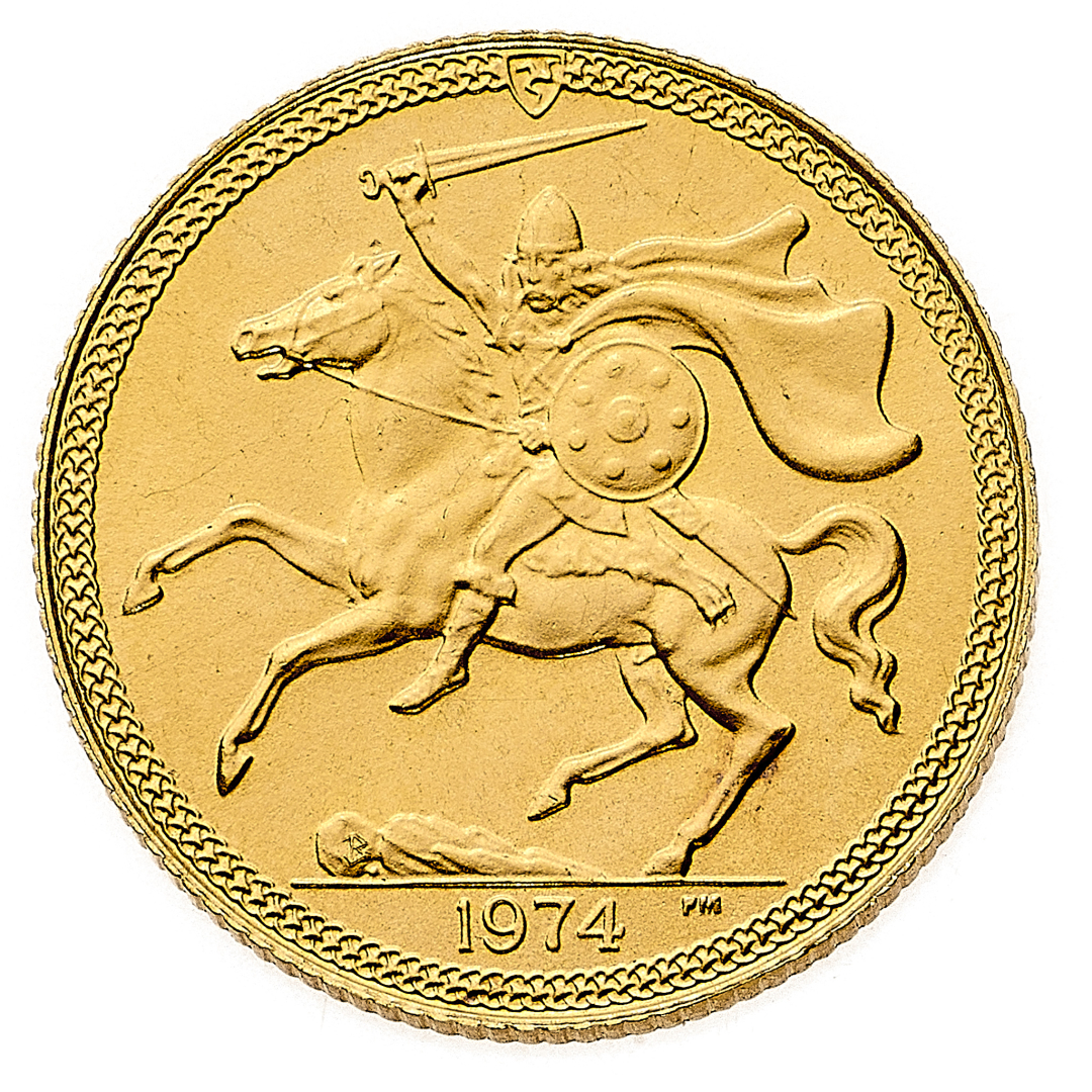 Elizabeth II (1952-2022) - Sovereign 1974 - Zecca: Probjoy - Diritto: effigie della Regina a destra - Rovescio: vichingo su cavallo al galoppo verso sinistra - gr. 8,13 - FDC
