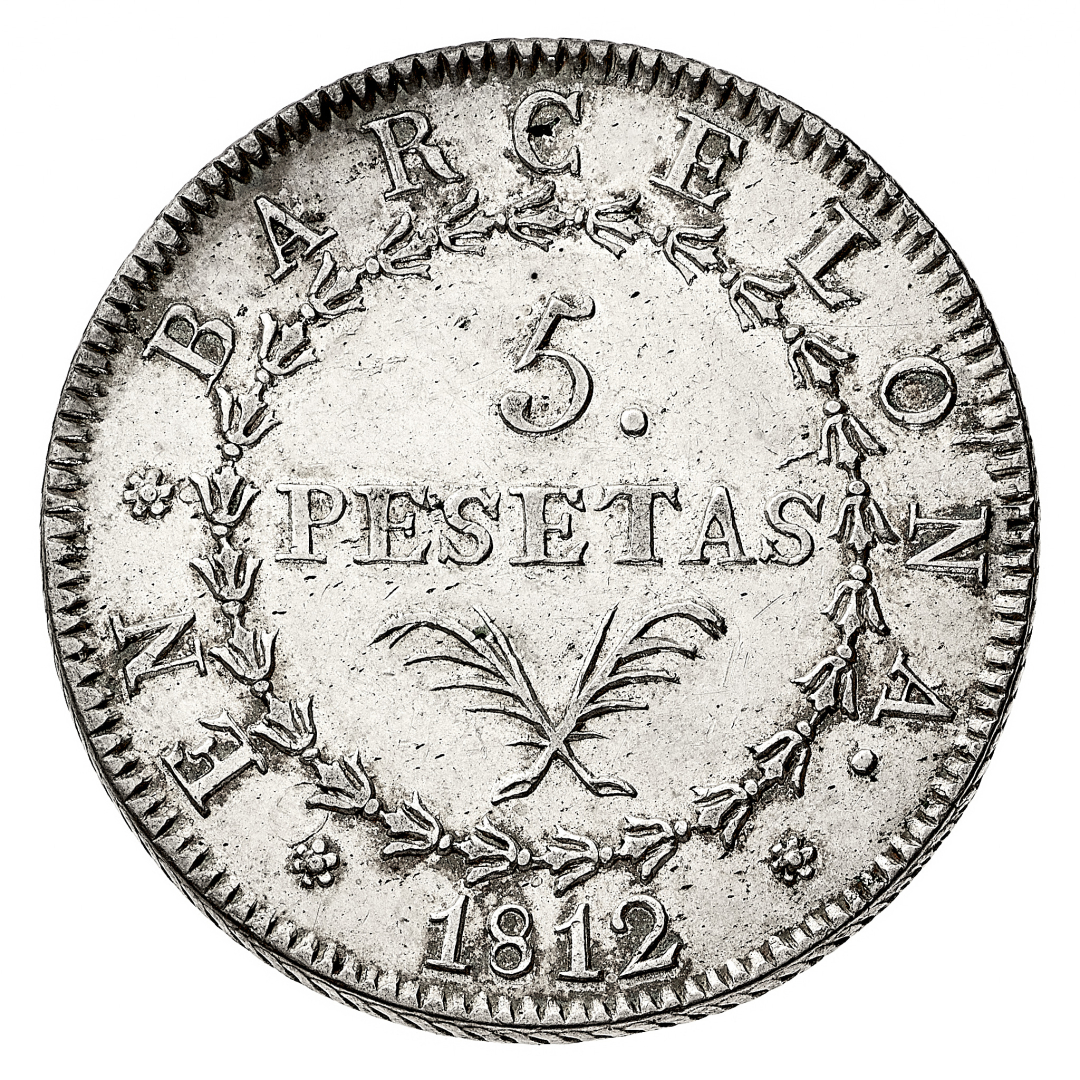 Giuseppe Napoleone (1808-1814) - 5 Pesetas 1812 - Zecca: Barcellona - Diritto: valore sopra due rami di alloro - Rovescio: stemma entro due rami di alloro - gr. 26,95 - Migliore di SPL