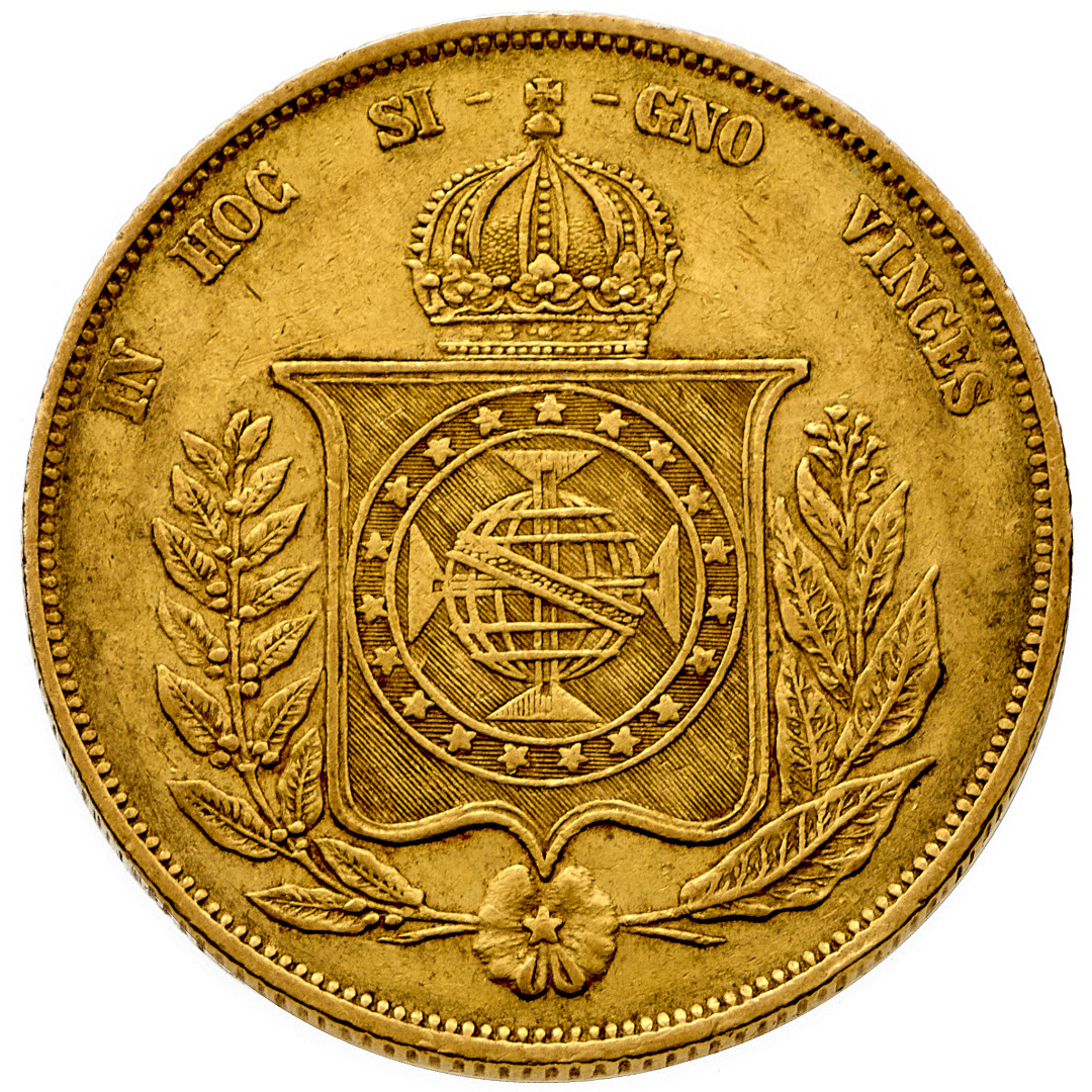 Pedro II (1831-1889) - 20.000 Reis 1867 - Zecca: Rio de Janeiro - Diritto: effigie del Re a sinistra - Rovescio: stemma coronato fra due rami annodati alla base - gr. 17,85 - Migliore di BB