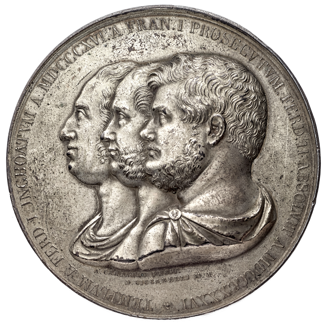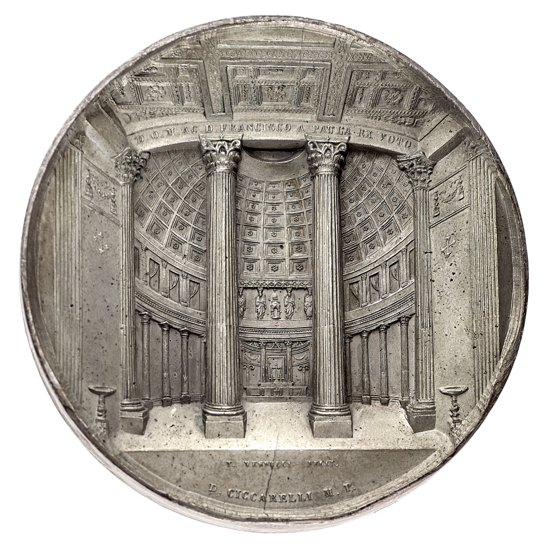 Regno delle Due Sicilie - Ferdinando II di Borbone (1830-1859) - Medaglia 1836 per il completamento della Basilica di San Francesco di Paola - Opus A. Carriello e T. Vernucci - Diametro mm. 63 e peso gr. 157,81 - Rara - Realizzata in metallo argentato - Colpetto al contorno, SPL