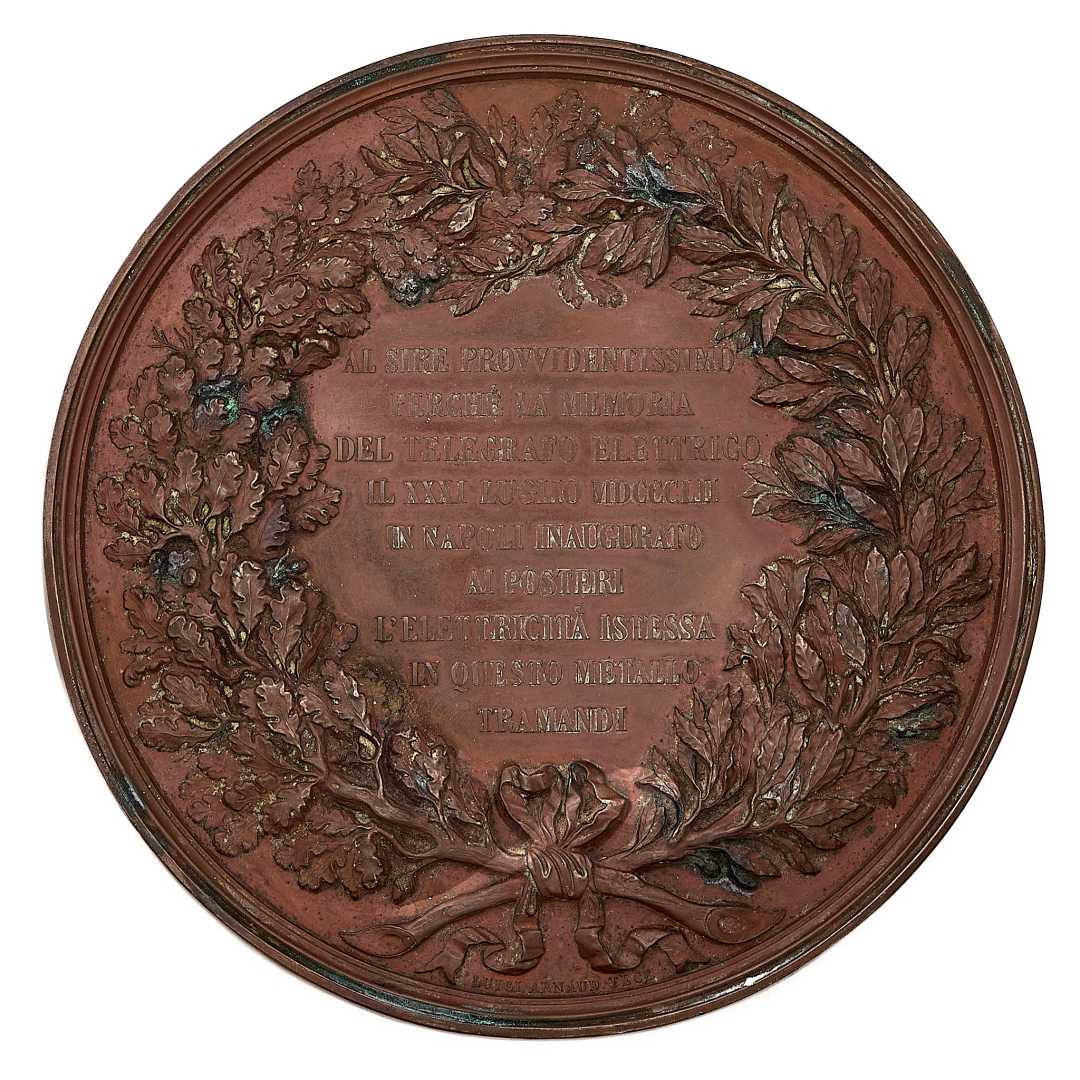 Regno delle Due Sicilie - Ferdinando II (1830-1859) - Medaglia galvanica 1852 per l'inaugurazione del telegrafo elettrico nel Regno delle Due Sicilie - gr. 780,00 - Opus L. Arnaud - Diametro mm. 149 e peso gr. 780 - Molto rara - Lieve colpetto al contorno, comunque SPL