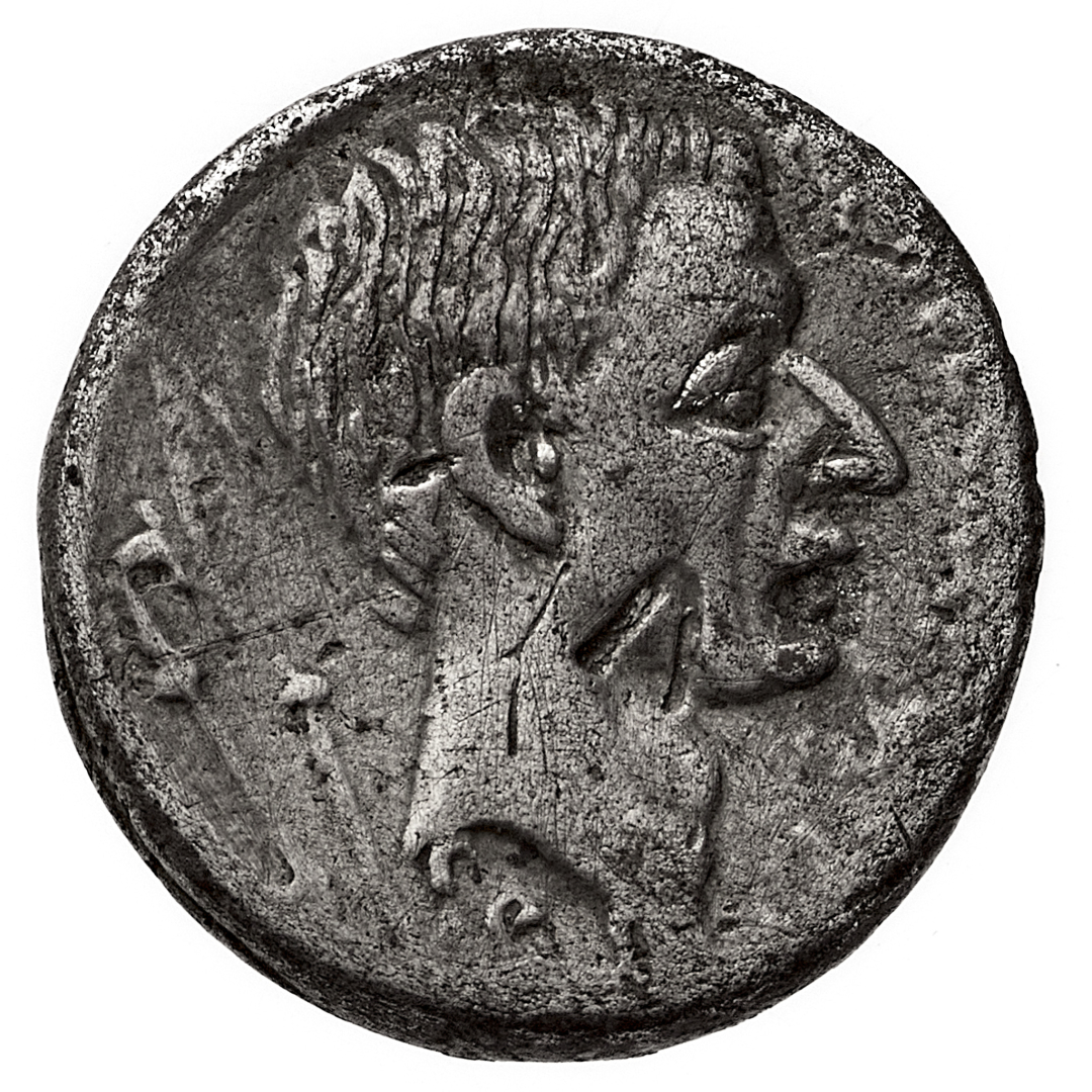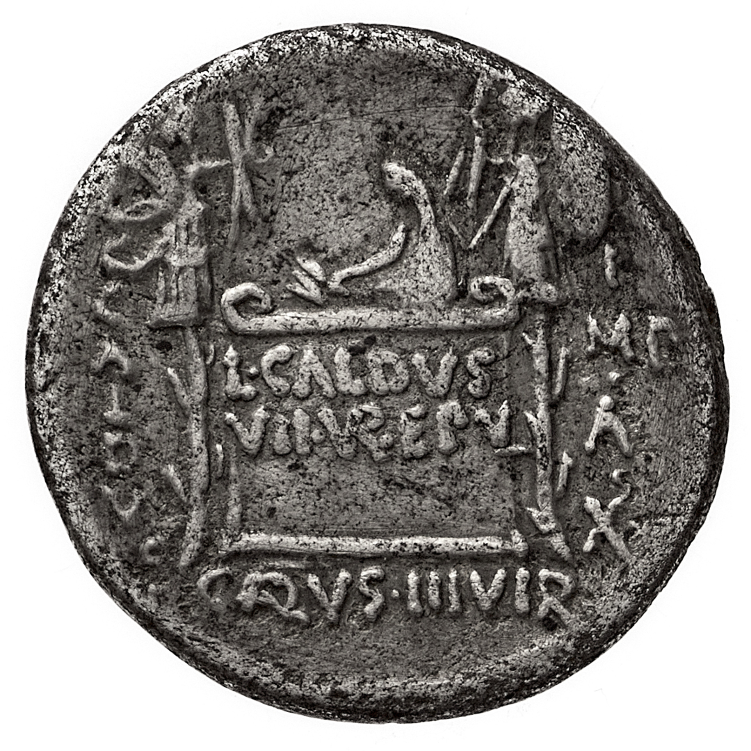 Denario al nome CALDVS IIIVIR databile al 51 a.C. - Zecca: Roma - Diritto: testa nuda di C. Coelius Caldus a destra; dietro la nuca carnyx e lancia - Rovescio: una figura rivolta a sinistra nell'atto di scrivere su una tavoletta; ai suoi lati due trofei variamente composti - gr. 3,37 - Rara - Contromarca al diritto, BB