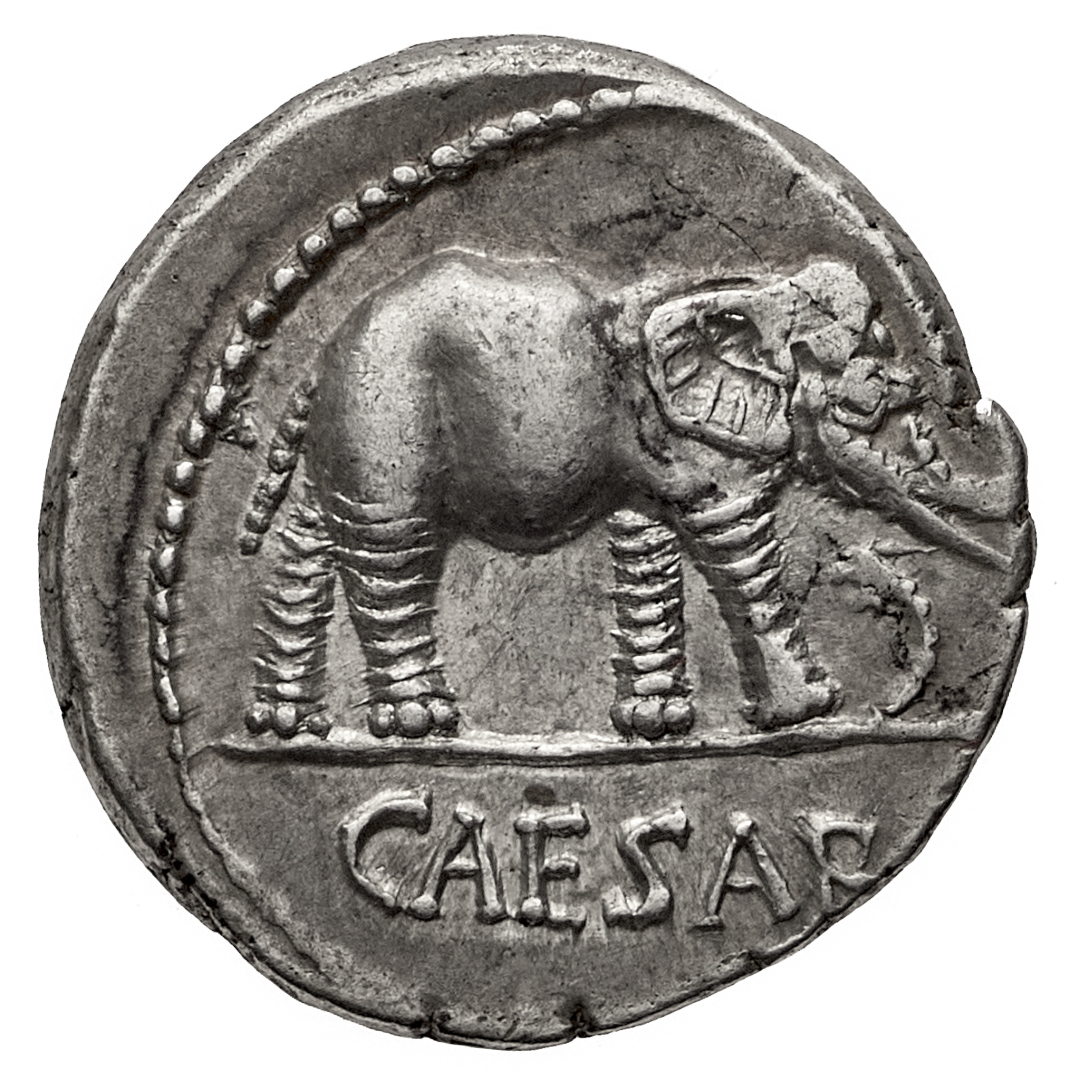 Giulio Cesare - Denario anonimo databile agli anni 49-48 a.C. - Zecca: itinerante al seguito di Giulio Cesare - Diritto: simboli pontificali - Rovescio: elefante in cammino verso destra, calpesta un drago con la zampa anteriore destra - gr. 3,92 - q.SPL