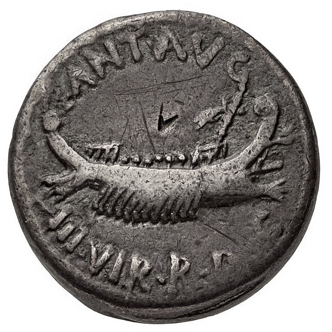 Marco Antonio - Denario databile agli anni 32-31 a.C., Legio XII - Zecca: itinerante al seguito di Marco Antonio - Diritto: nave verso destra - Rovescio: aquila legionaria fra due stendardi - gr. 3,23 - Contromarche, q.BB