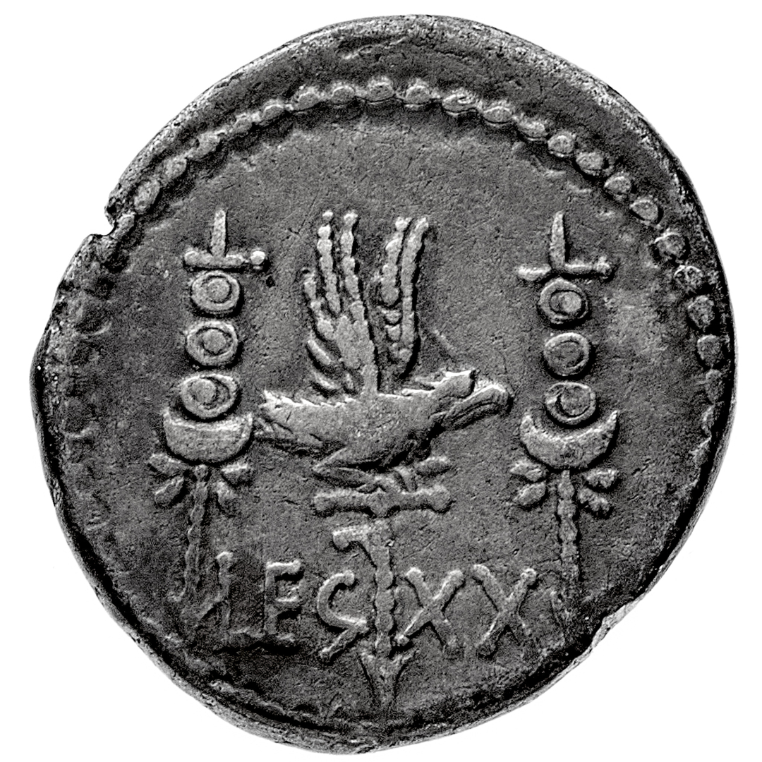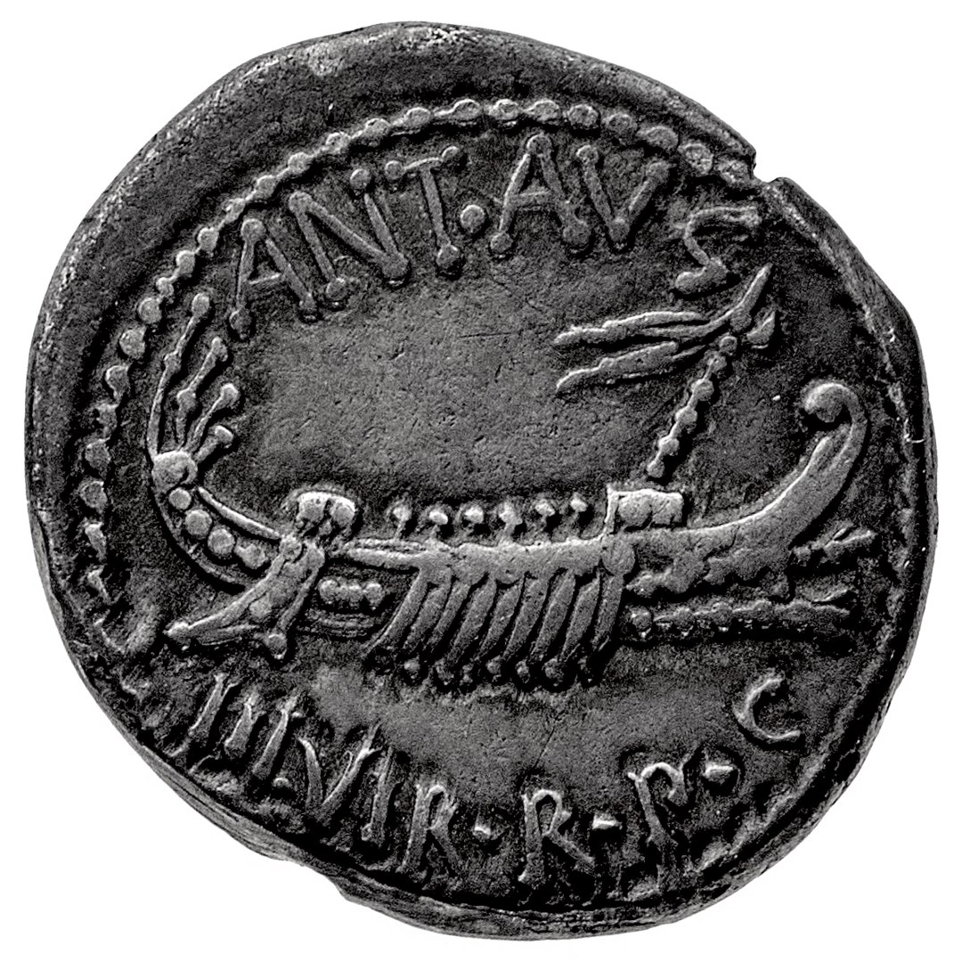 Marco Antonio - Denario Legionario databile agli anni 32-31 a.C., Legio XX - Zecca: itinerante al seguito di Marco Antonio - Diritto: nave verso destra - Rovescio: aquila legionaria fra due stendardi - gr. 3,64 - BB - Corredata dal cartellino di Oscar Rinaldi