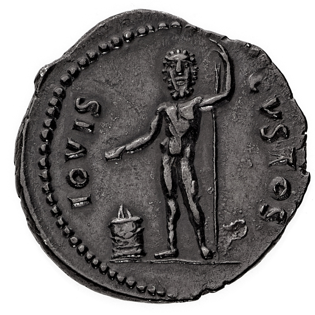 Denario con il titolo di Cesare databile al 76 d.C. - Zecca: Roma - Diritto: testa laureata dell'Imperatore a destra - Rovescio: Giove stante di fronte con uno scettro nella mano sinistra, nell'atto di sacrificare con una patera su un altare acceso ai suoi piedi - gr. 2,87 - Gradevole patina scura, q.SPL
