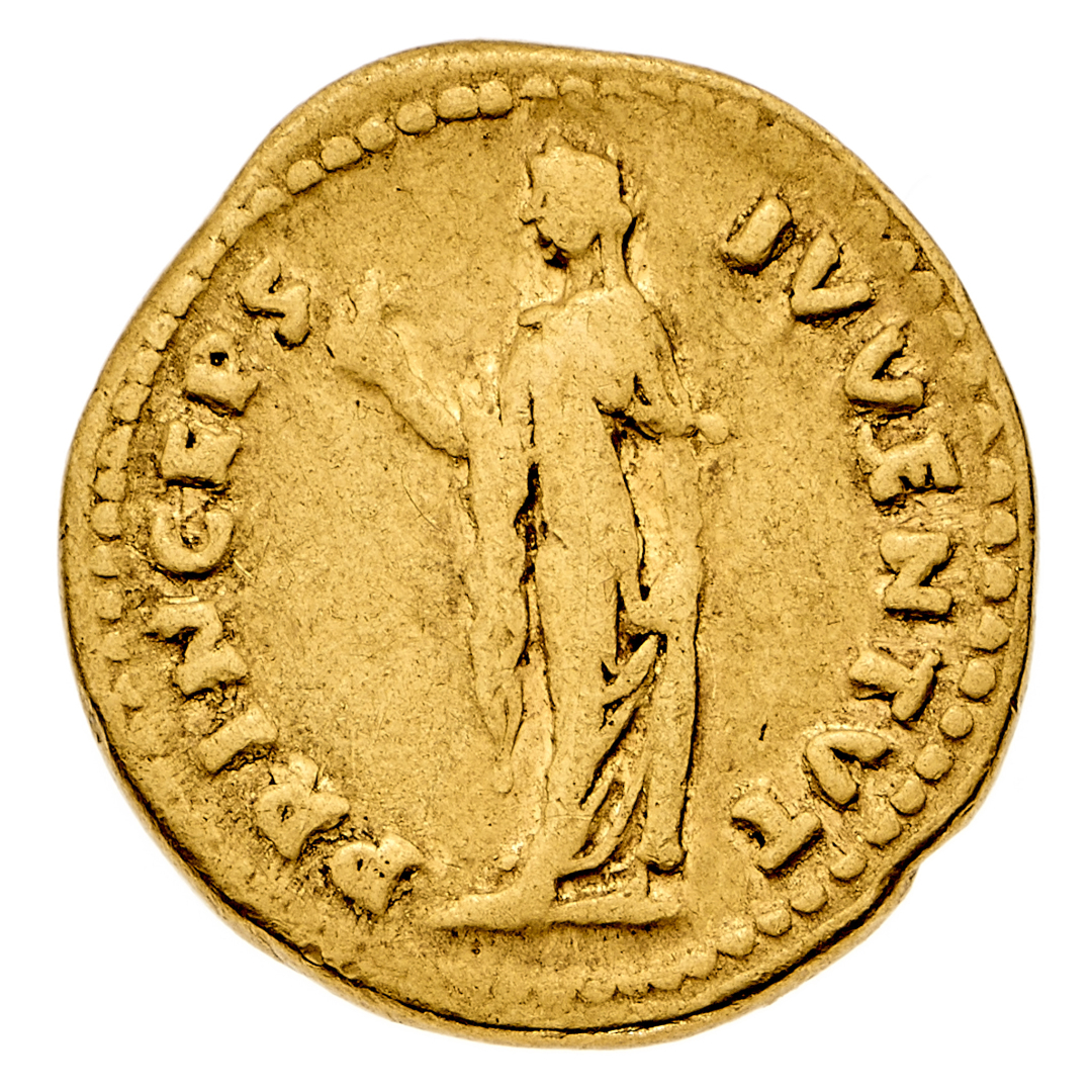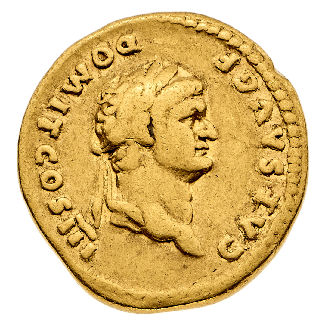 Aureo con il titolo di Cesare databile al 75 d.C. - Zecca: Roma - Diritto: testa laureata di Domiziano a destra - Rovescio: la Spes in cammino verso sinistra tiene il bocciolo di un fiore con la mano destra e si solleva lo strascico della veste con la sinistra - gr. 7,12 - BB