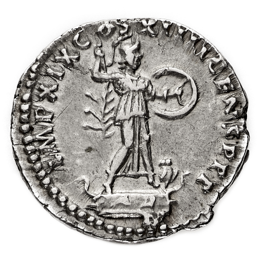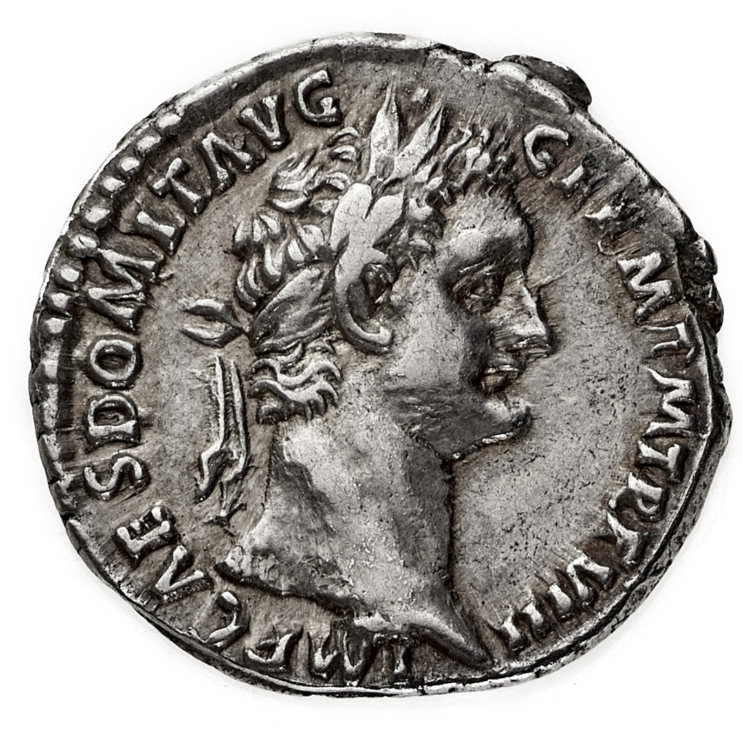 Denario databile al 91 d.C. - Zecca: Roma - Diritto: testa laureata dell'Imperatore a destra - Rovescio: Minerva stante a destra sul capitello di una colonna rostrale, tiene una lancia con la mano destra e uno scudo con la sinistra; in basso a destra un gufo - gr. 3,47 - q.SPL