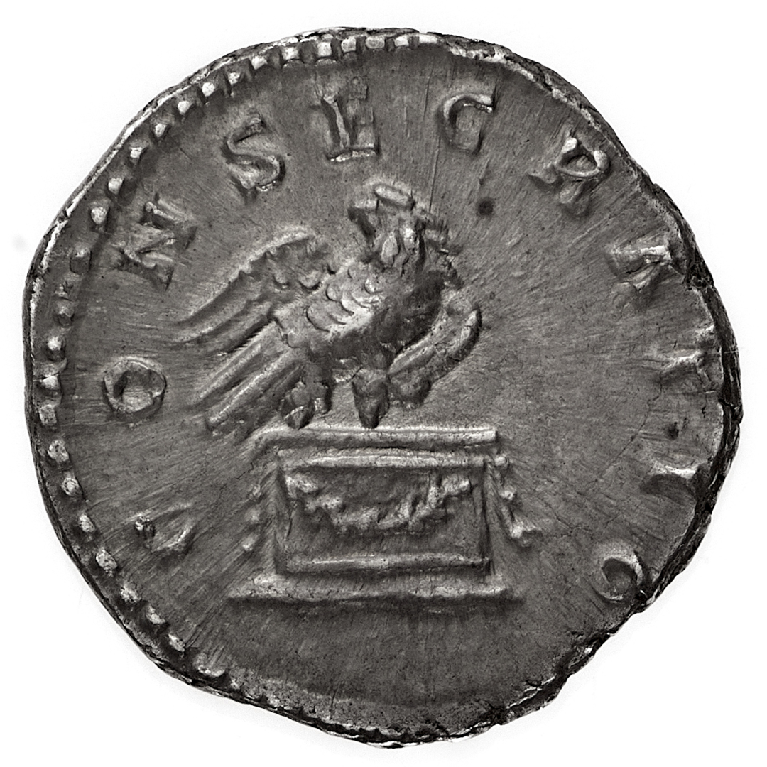 Denario postumo "di consacrazione" al nome e con l'effigie di Antonino Pio coniato sotto l'impero di Marco Aurelio - Zecca: Roma - Diritto: testa dell'Imperatore a destra - Rovescio: aquila stante a destra su basamento decorato - gr. 3,22 - SPL