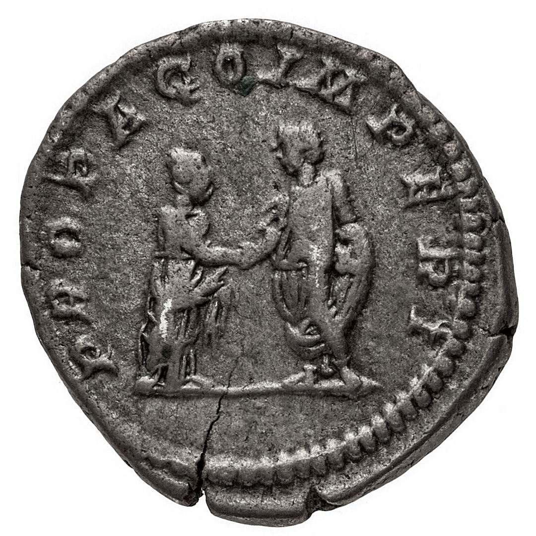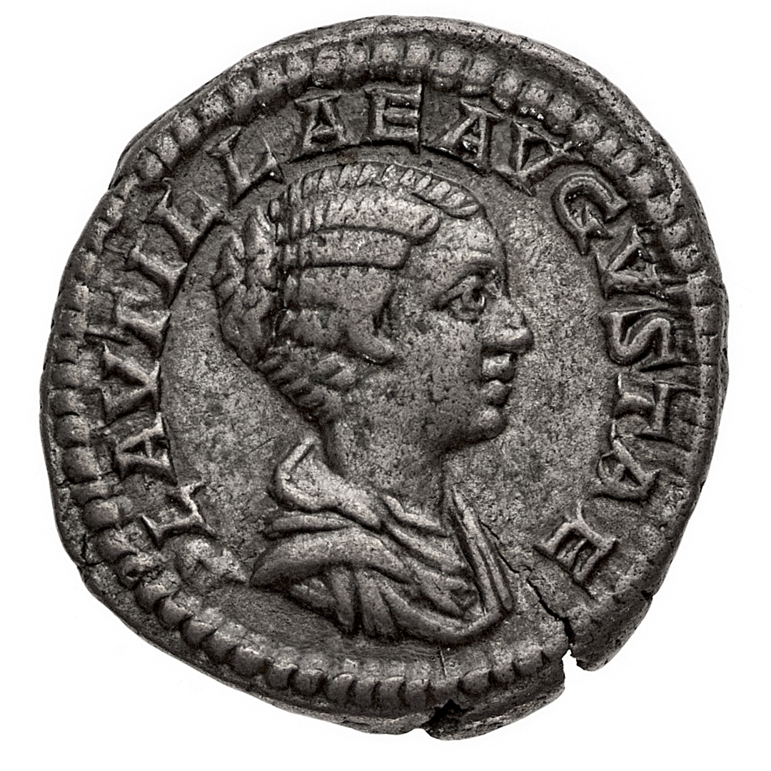 Denario al nome e con l'effigie di Plautilla, moglie dell'Imperatore, databile al 202 d.C. - Zecca: Roma - Diritto: busto drappeggiato di Plautilla a destra - Rovescio: Caracalla e Plautilla stanti di fronte nell'atto di stringersi la mano - gr. 3,29 - BB