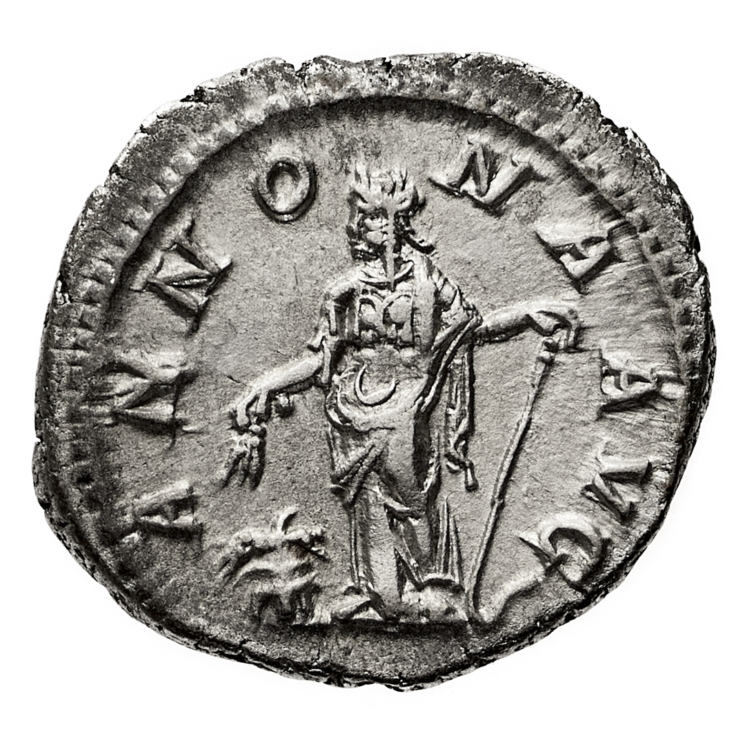 Denario databile al 231 d.C. - Zecca: Roma - Diritto: busto laureato e drappeggiato ell'Imperatore a destra - Rovescio: l'Annona stante a sinistra tiene due spighe di grano con la mano destra e un'ancora con la sinistra; ai suoi piedi un modius - gr. 2,77 - SPL