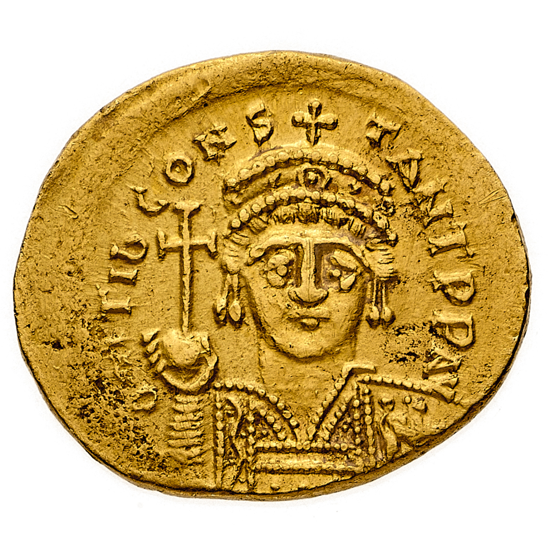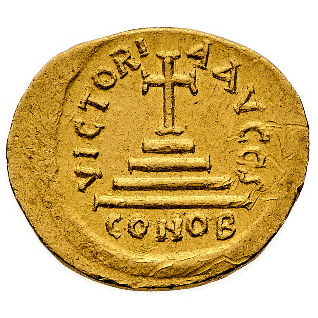 Tiberio II Costantino (578-582) - Solido - Zecca: Cartagine - Diritto: mezzo busto elmato e diademato dell'Imperatore con globo crucigero nella mano destra - Rovescio: croce potenziata su un basamento di quattro gradini - gr. 4,43 - Rara - Lievi graffi al rovescio, q.SPL