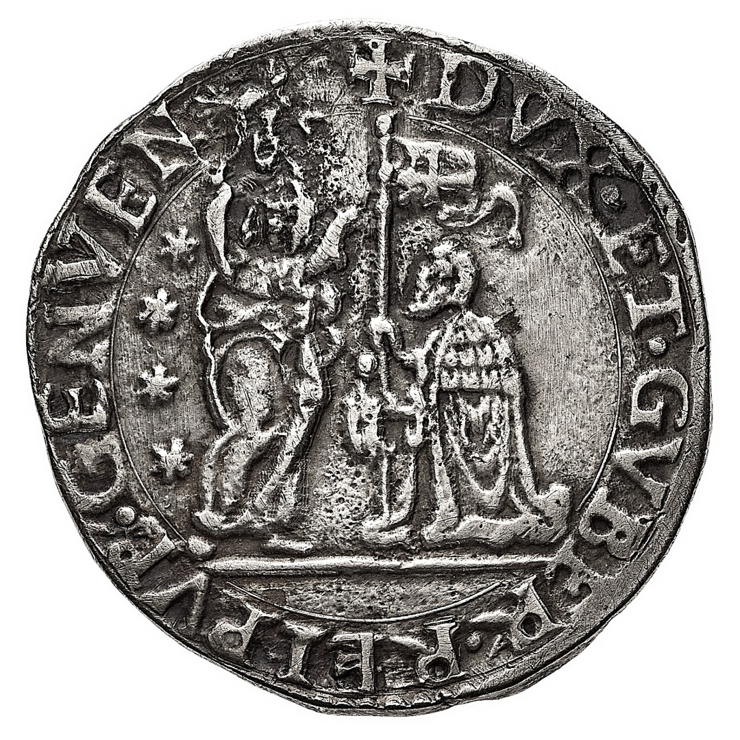 Governo dei Dogi Biennali (1528-1797) - Testone della Benedizione di I tipo 1554 - Diritto: Gesù Cristo stante a destra nell'atto di benedire il Doge genuflesso mentre tiene il vessillo della Repubblica - Rovescio: castello sormontato da croce patente con data ai lati - gr. 9,37 - Rara - Patina iridescente, q.SPL