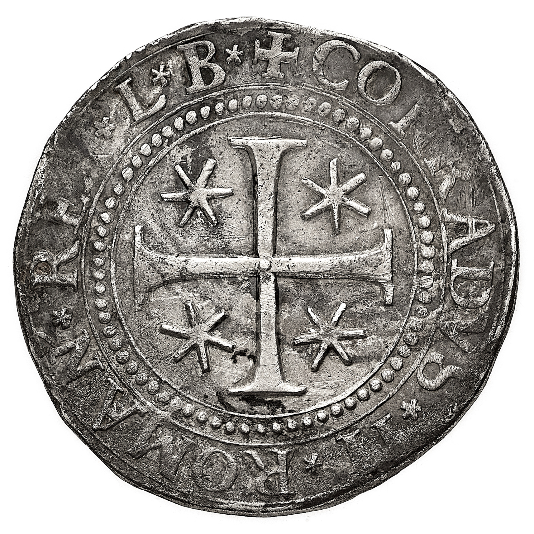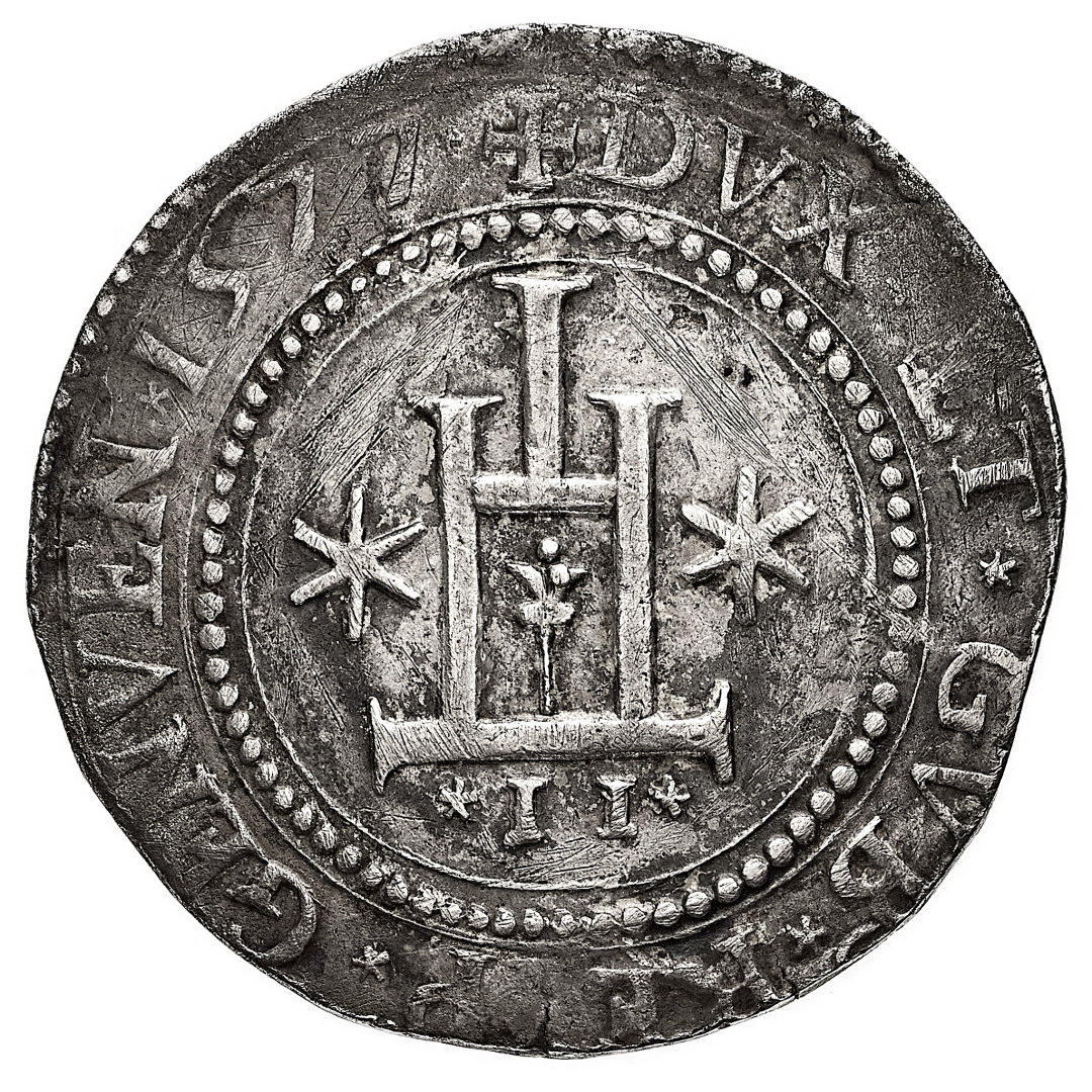 Governo dei Dogi Biennali (1528-1797) - Mezzo Scudo 1577 - Diritto: castello con due croci ai lati - Rovescio: croce patente accantonata da quattro stelle - gr. 18,52 - Sigle LB - Rara - Patina di medagliere, q.SPL - Proveniente dalla Collezione Astengo come da cartellino di catalogazione