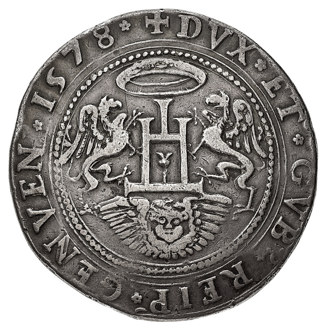 Governo dei Dogi Biennali (1528-1797) - Da 1 Scudo e mezzo 1578 - Diritto: castello sormontato da una corona e sorretto da due grifoni; sotto una testa alata - Rovescio: croce ornata accantonata da quattro teste alate - gr. 56,19 - Sigle LB - Molto rara - Patina di medagliere, BB - Proveniente dalla Collezione Pesce, asta Christie's, Milano 9-10.6.2003, n. 205