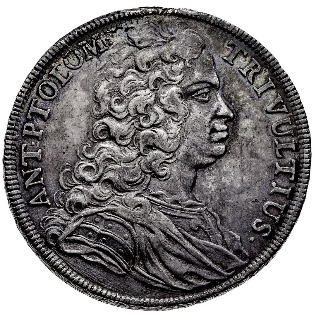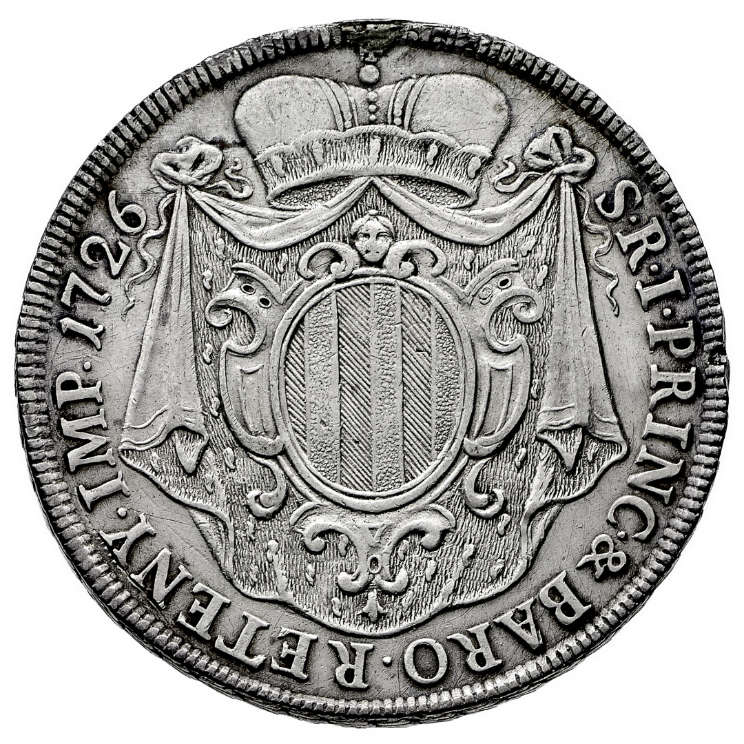 Antonio Tolomeo Gallio - Trivulzio Principe del S.R.I. (1708-1767) - Tallero 1726 - Diritto: busto paludato e corazzato del Principe a destra - Rovescio: stemma entro padiglione coronato - gr. 28,95 - Molto rara - Tracce di montatura, BB