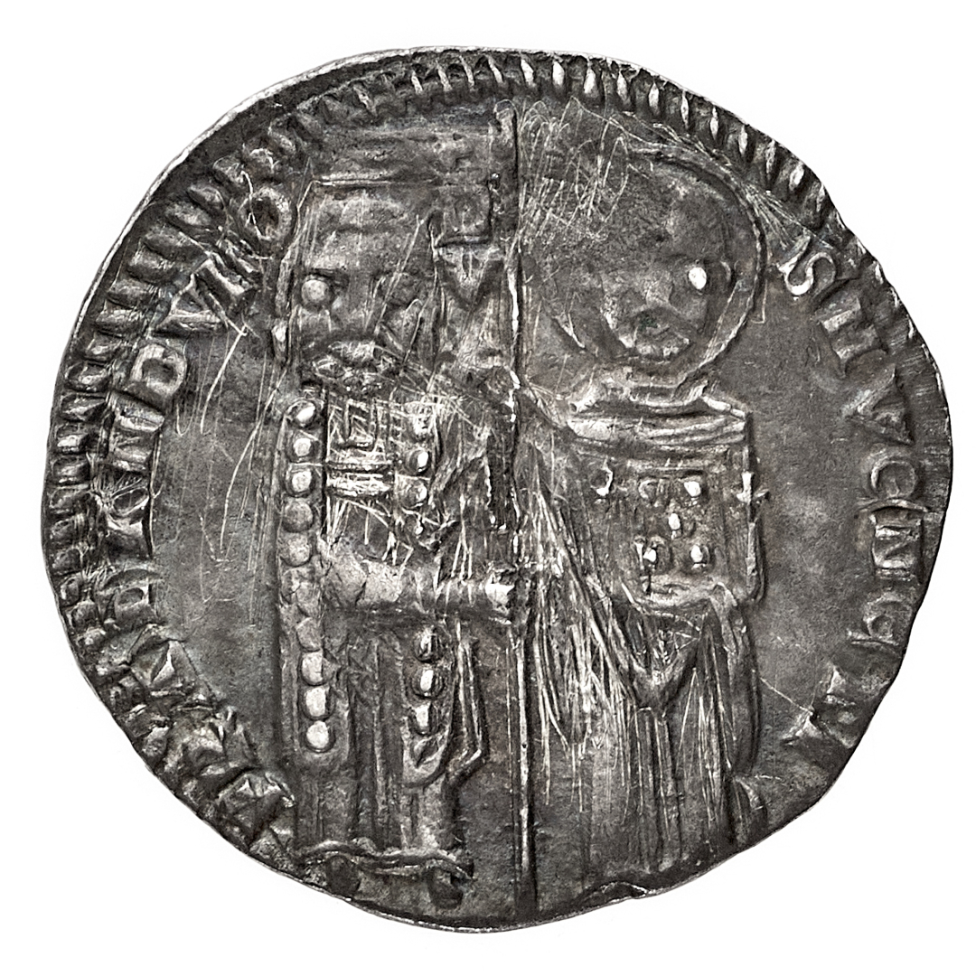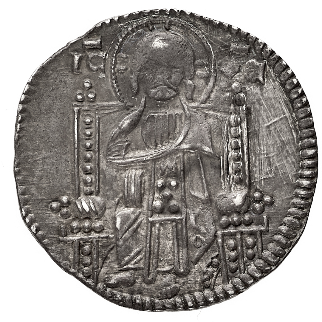 Francesco Dandolo (1328-1339) - Grosso detto "Matapan" - Zecca: Venezia - Diritto: il Doge riceve da San Marco il vessillo della Repubblica, entrambi stanti di fronte affiancati - Rovescio: Gesù Cristo benedicente seduto in trono di fronte - gr. 2,17 - Migliore di BB - Corredata da cartellino di antica collezione