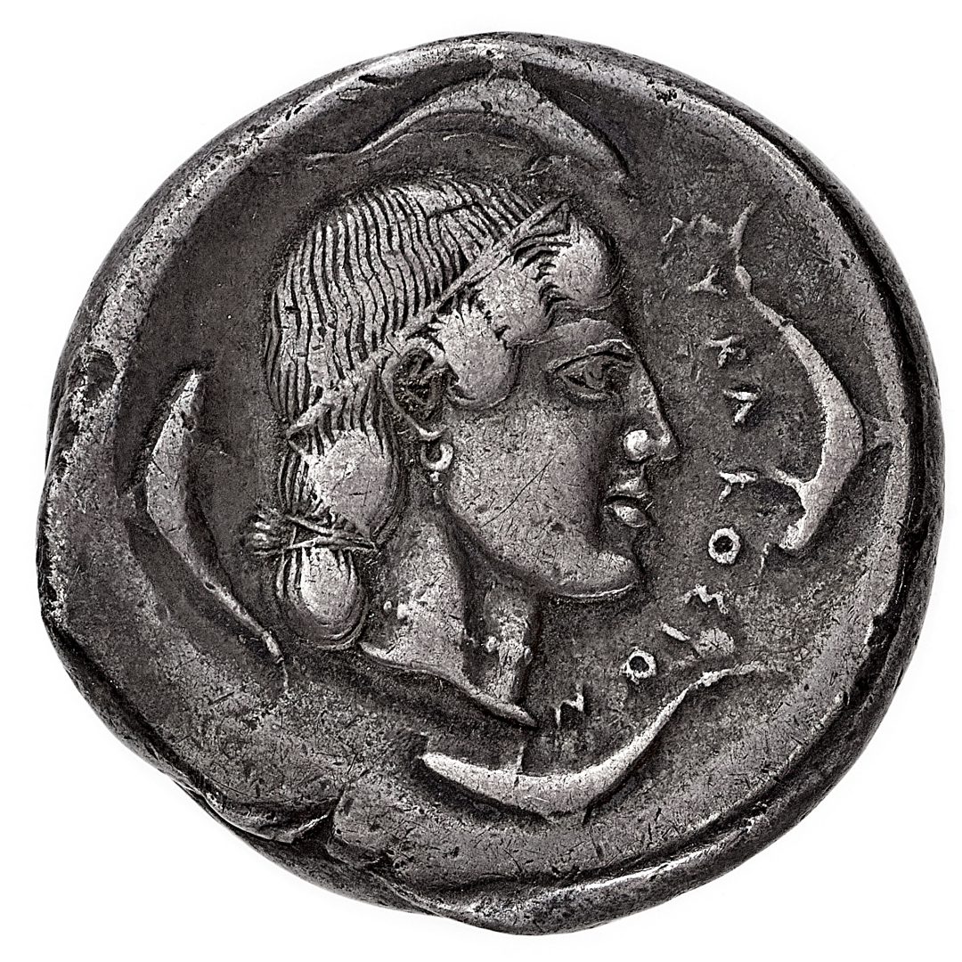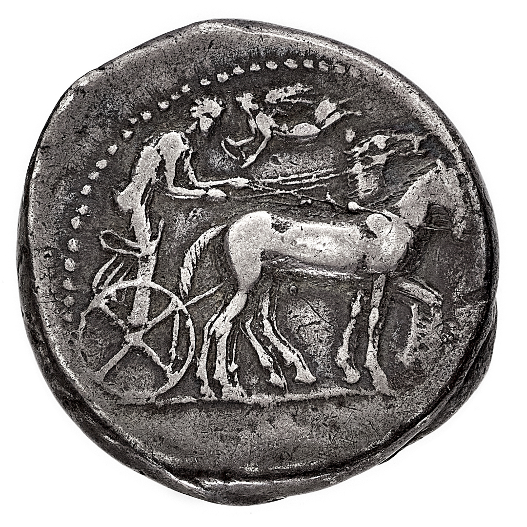 Siracusa - Periodo della Seconda Democrazia (466-405 a.C.) - Tetradramma databile al periodo 466-460 a.C. circa - Diritto: quadriga al passo verso sinistra sovrastata dalla Vittoria in volo nell'atto di incoronare l'auriga - Rovescio: testa di Aretusa a destra; attorno quattro delfini - gr. 17,21 - Rara - BB