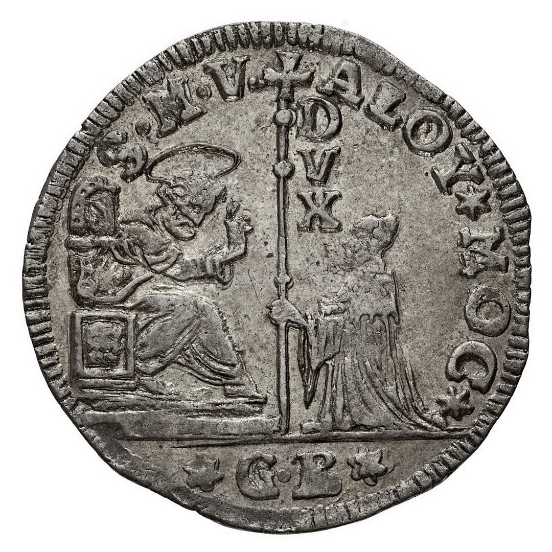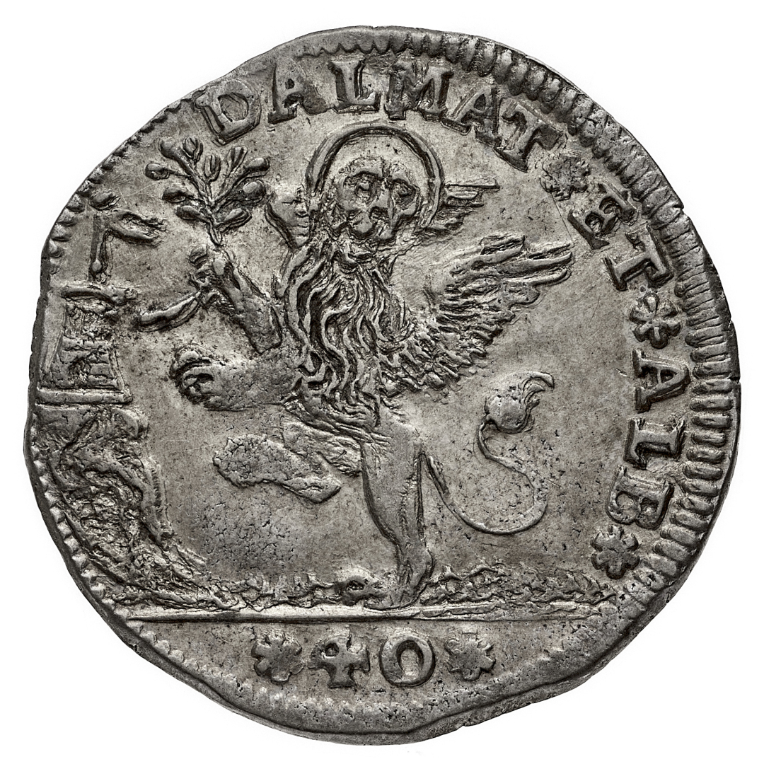 Alvise II Mocenigo (1700-1709) - Mezzo Leone da 40 Soldi per la Dalmazia e l'Albania - Zecca: Venezia - Diritto: il Doge genuflesso tiene un'asta culminante in una croce e riceve la benedizione da San Marco che gli sta di fronte - Rovescio: il leone di San Marco rampante regge un ramo d'ulivo con la zampa destra - gr. 5,76 - Sigle GB - Rara - SPL