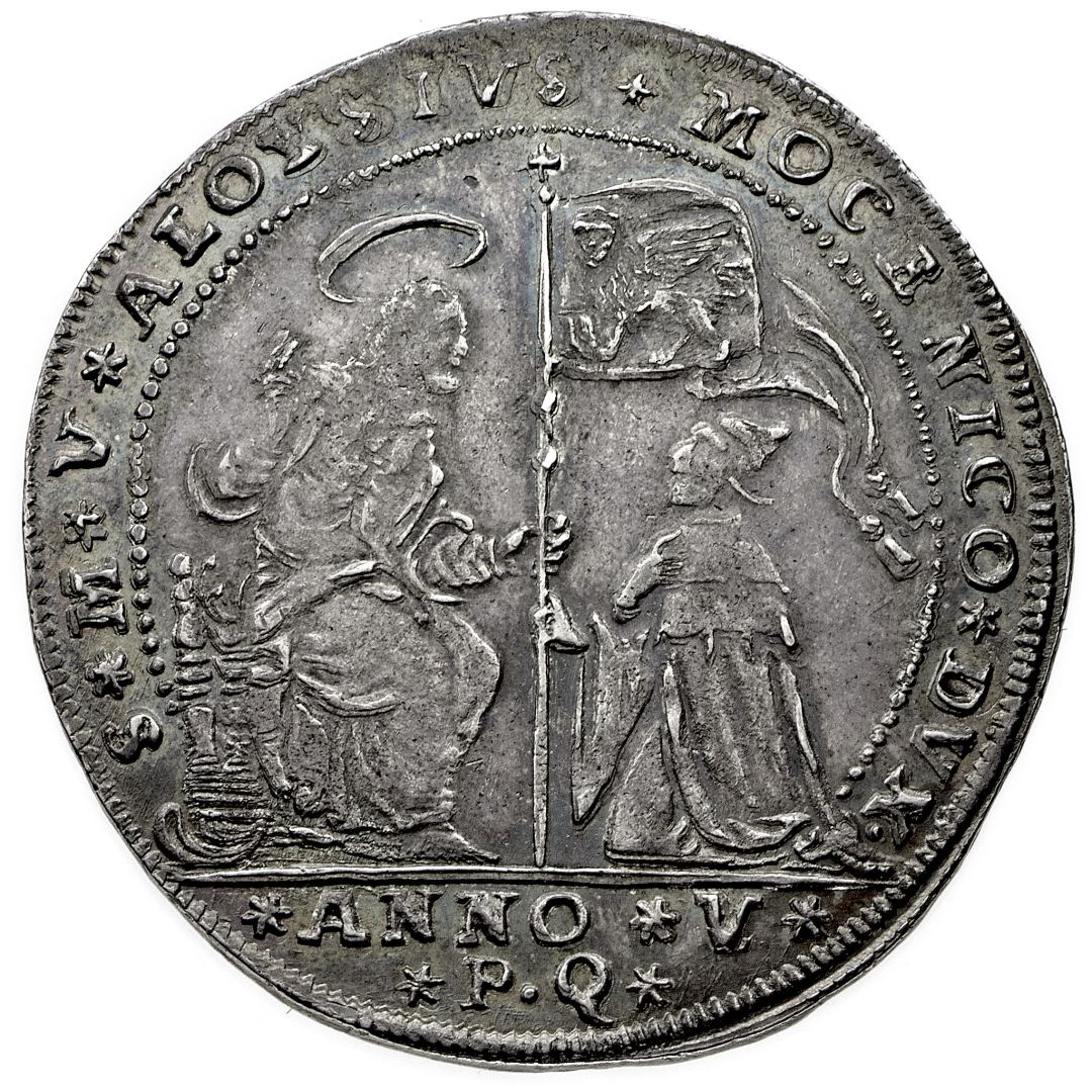 Alvise III Mocenigo (1722-1732) - Osella Anno V (1726) NGC MS 62 - Zecca: Venezia - Diritto: il Doge genuflesso riceve il vessillo della Repubblica da San Marco che gli siede di fronte - Rovescio: vascello da guerra in navigazione verso sinistra insieme a navigli minori - gr. 9,84 - Sigle PQ - Molto rara - Patina di medagliere - Cert. #8585048-013 (TOP POP!)