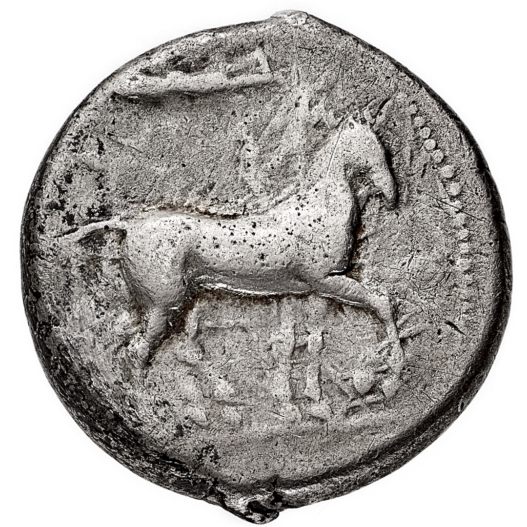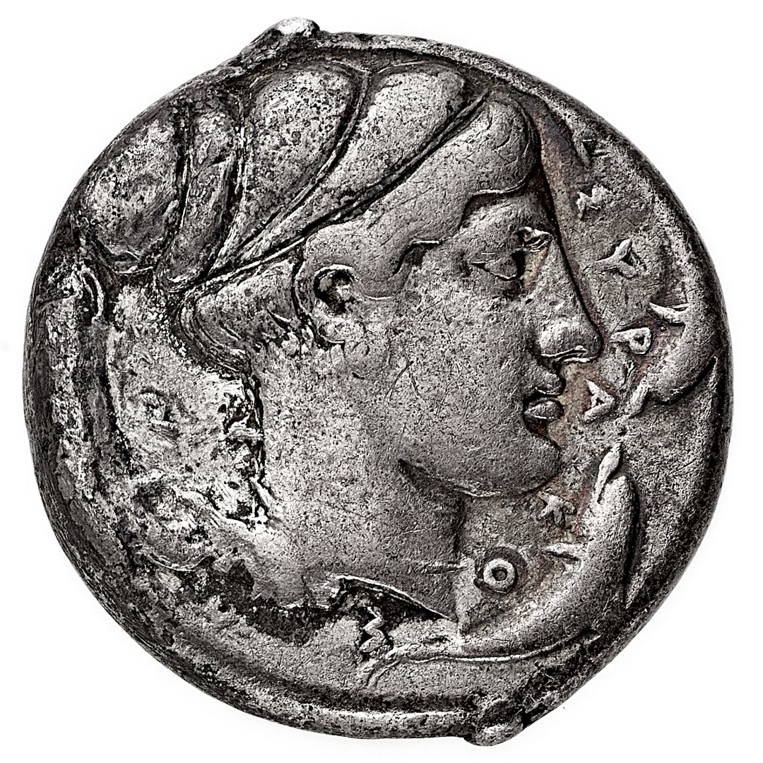 Siracusa - Periodo della Seconda Democrazia (466-406 a.C.) - Tetradramma databile al periodo 430-420 a.C. - Diritto: quadriga al passo verso destra sovrastata dalla Vittoria in volo nell'atto di incoronare i cavalli - Rovescio: testa di Aretusa a destra; attorno quattro delfini - gr. 16,69 - BB