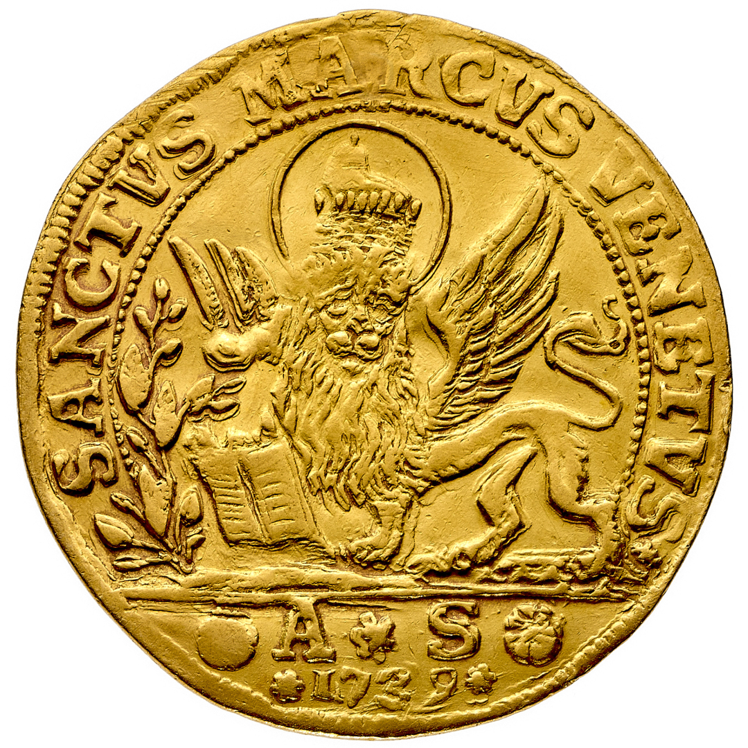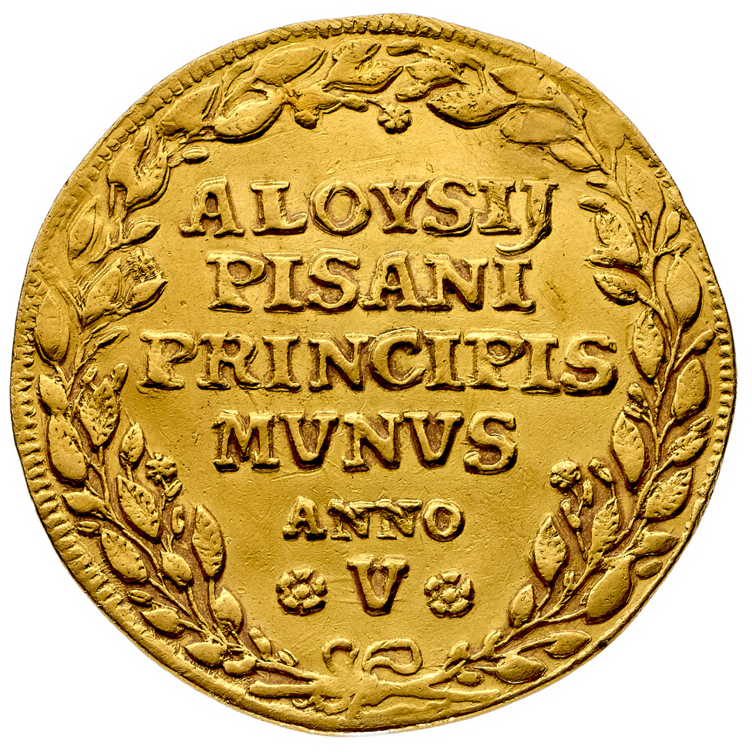 Alvise Pisani (1735-1741) - Osella da 4 Zecchini Anno V (1739) - Zecca: Venezia - Diritto: San Giovanni stante di fronte con il volto a sinistra nell'atto di predicare - Rovescio: legenda su sei righe orizzontali entro corona di alloro - gr. 13,86 - Sigle AS - Rara - Lieve segno di montatura, altrimenti SPL