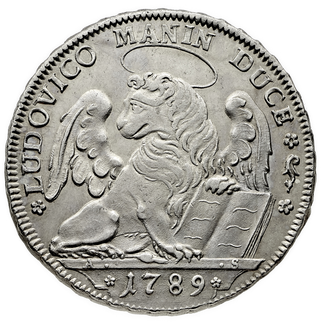 Ludovico Manin (1789-1797) - Tallero per il Levante 1789 - Zecca: Venezia - Diritto: il leone di San Marco seduto a destra retrospiciente mostra il Vangelo aperto - Rovescio: busto di donna a destra - gr. 28,61 - Rara - Patina di medagliere, SPL
