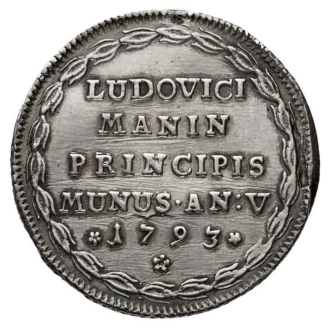 Ludovico Manin (1789-1797) - Osella Anno V 1793 - Zecca: Venezia - Diritto: la Vergine coronata di stelle allarga le braccia in atteggiamento di protezione; sullo sfondo elementi tipici del paesaggio veneziano - Rovescio: legenda e data entro cinque righe orizzontali entro corona di alloro - gr. 9,60 - Tracce di montatura, BB - In lotto con un altro esemplare di qualità leggermente inferiore