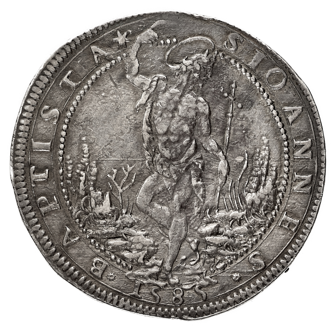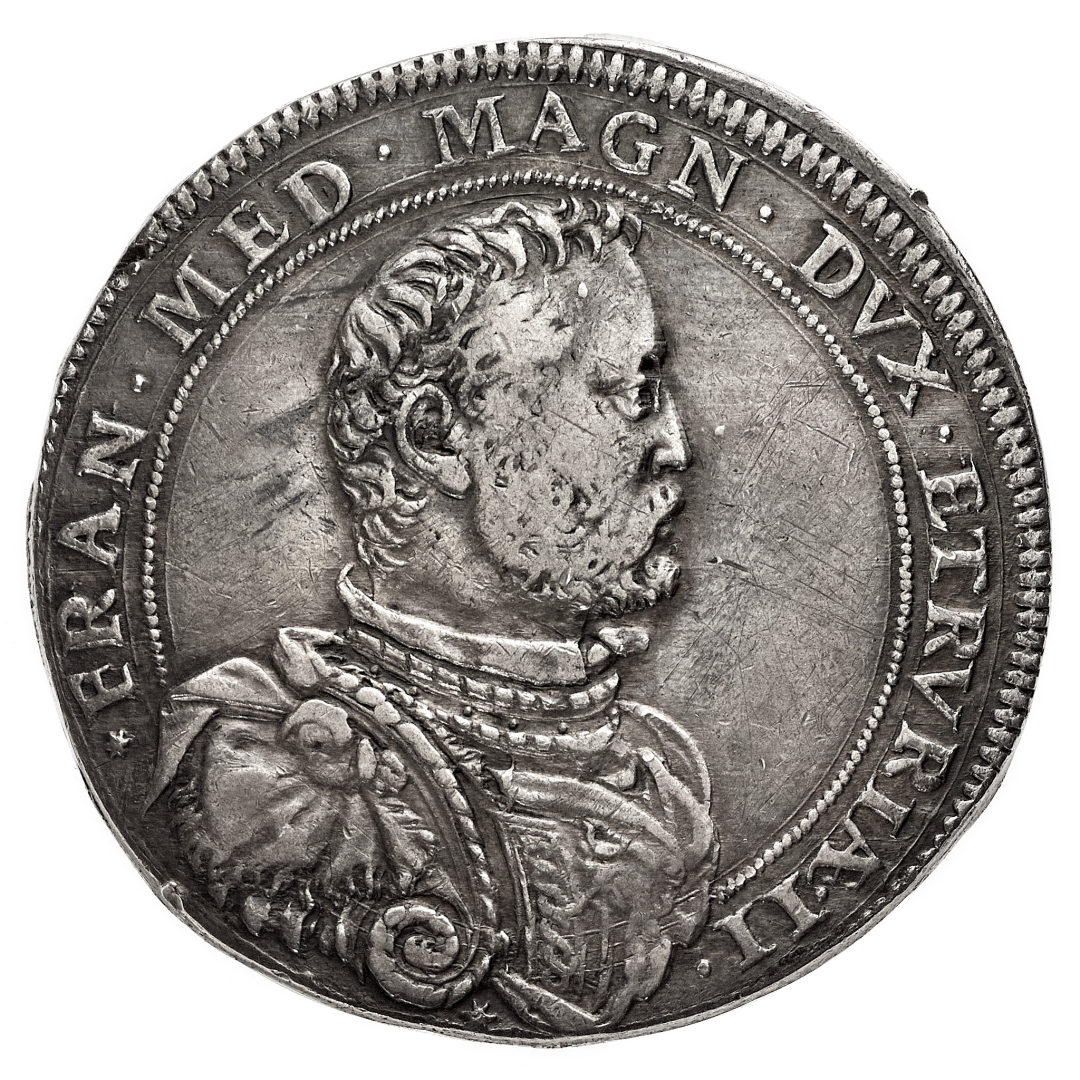 Francesco I de' Medici (1574-1587) - Piastra 1585 - Zecca: Firenze - Diritto: busto drappeggiato e corazzato del Granduca a destra - Rovescio: San Giovanni stante di fronte con il volto rivolto a destra alza la mano destra benedicente e tiene una lunga croce con la sinistra - gr. 32,41 - Migliore di BB