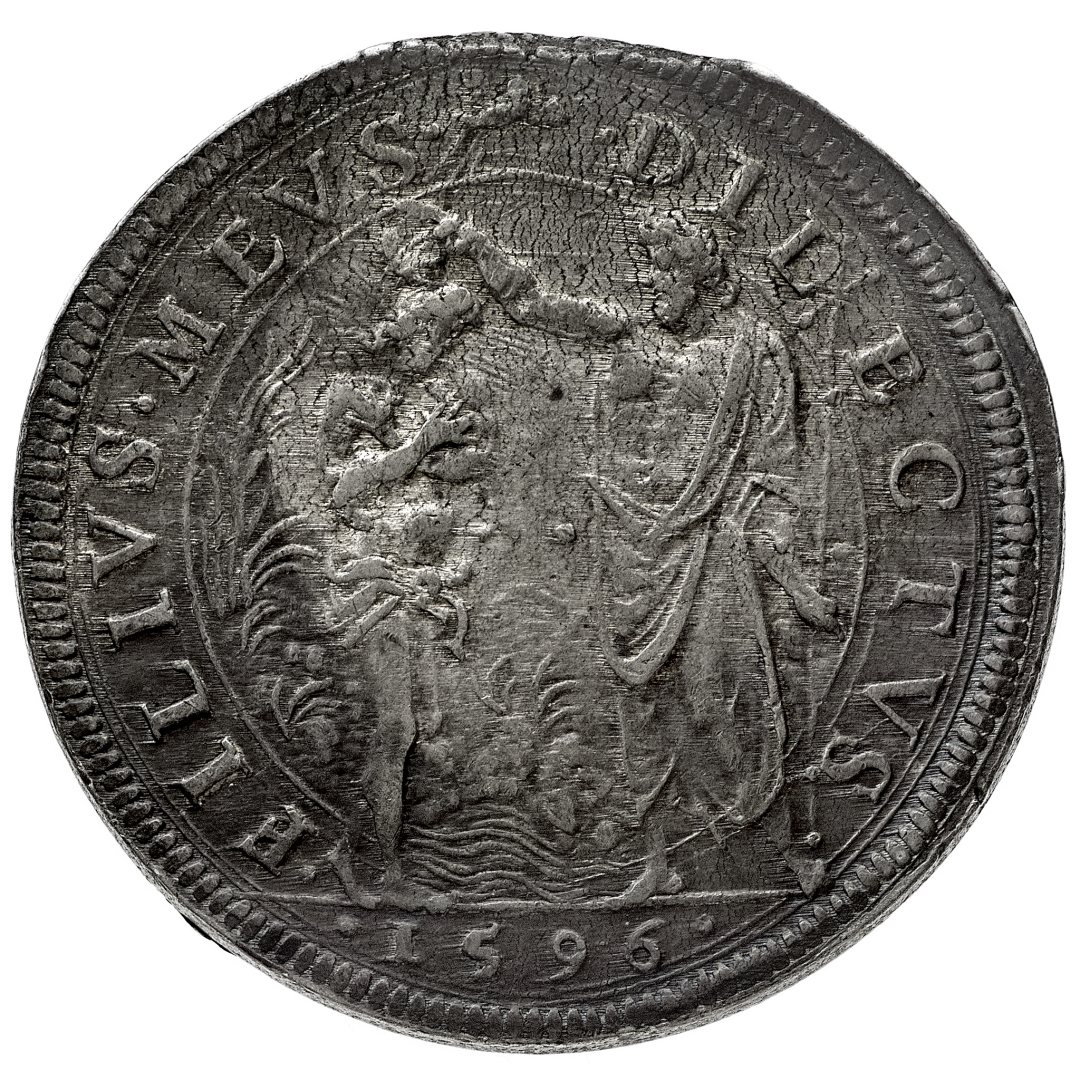 Ferdinando I de' Medici (1587-1608) - Piastra 1596 - Zecca: Firenze - Diritto: busto drappeggiato del Granduca a destra - Rovescio: la scena del Battesimo di Gesù Cristo - gr. 32,44 - Rara - Usuali difetti di conio, q.SPL - Proveniente dall'asta Ratto, Milano 8-9.5.1953, n. 1221 e corredata dalla bustina originale