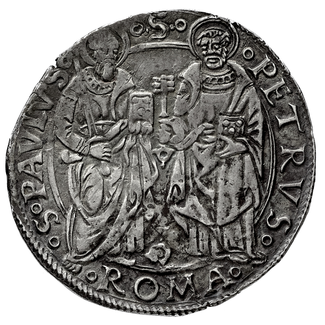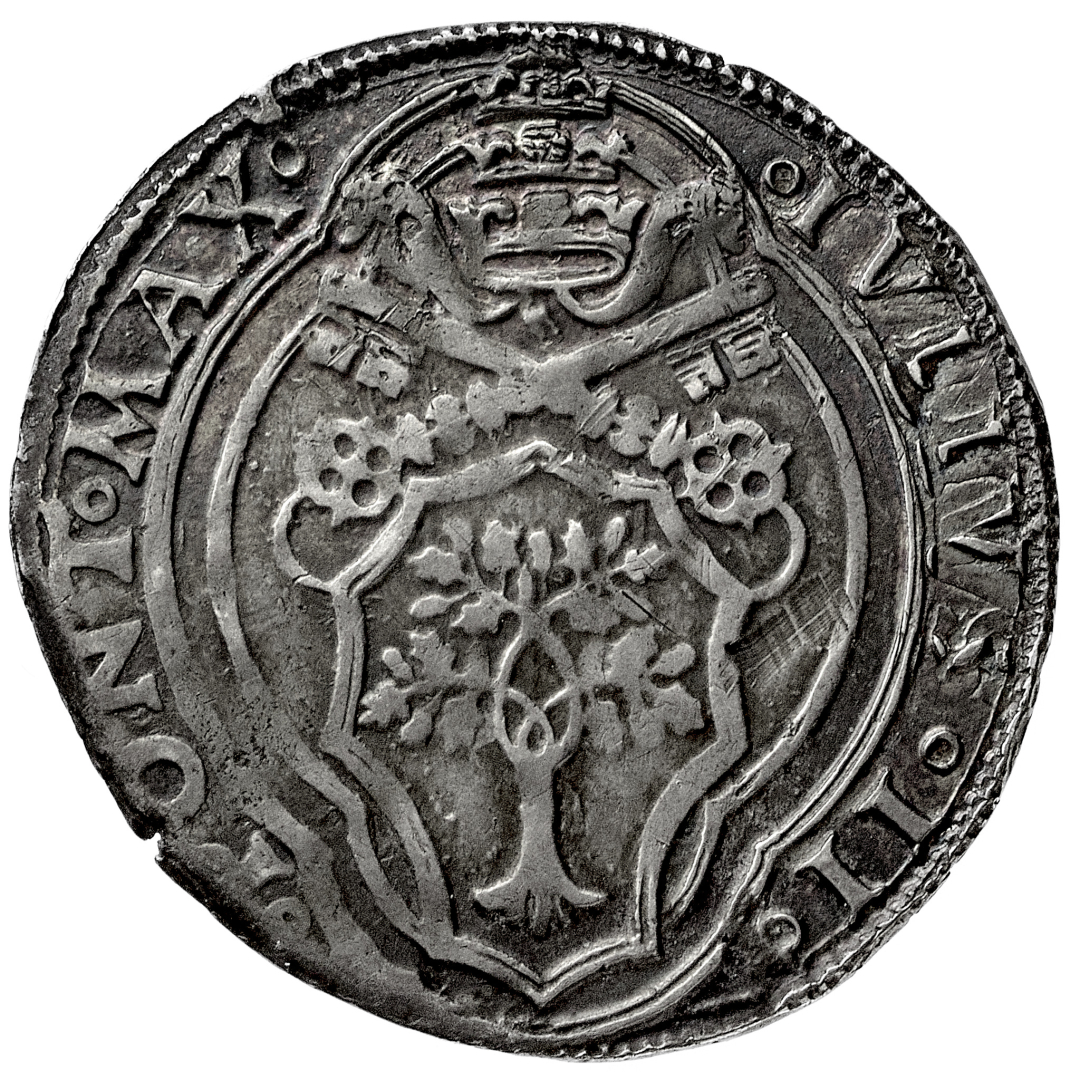 Giulio II (1503-1513) - Giulio - Zecca: Roma - Diritto: stemma sormontato dalle chiavi decussate e dalla tiara - Rovescio: San Pietro e San Paolo stanti di fronte - gr. 3,76 - BB