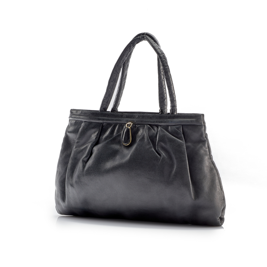 in blue Nappa leather with purple fabric lining. Double handle. Unique wide mouth opening held by teardrop details. Golden-tone metal hardware.