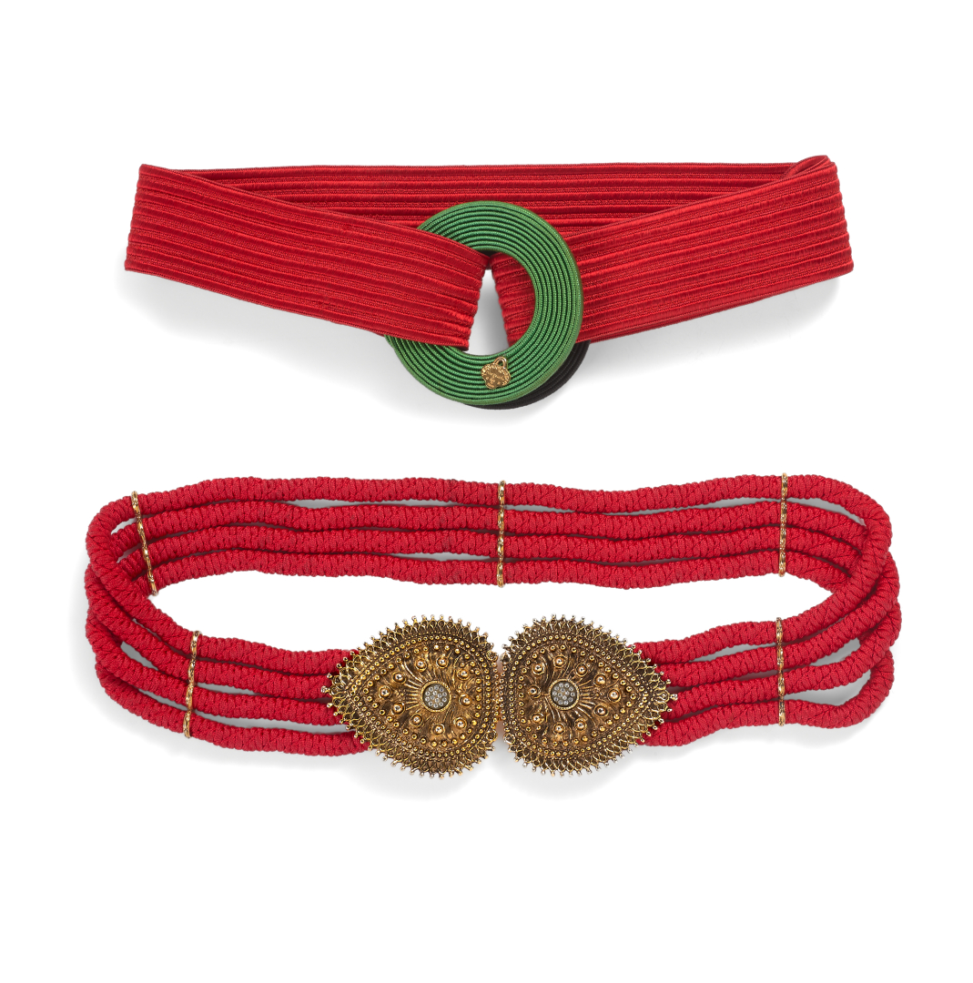 in red elastic tubular knit, red, green and black trimmings, golden-tone metal and crystals.