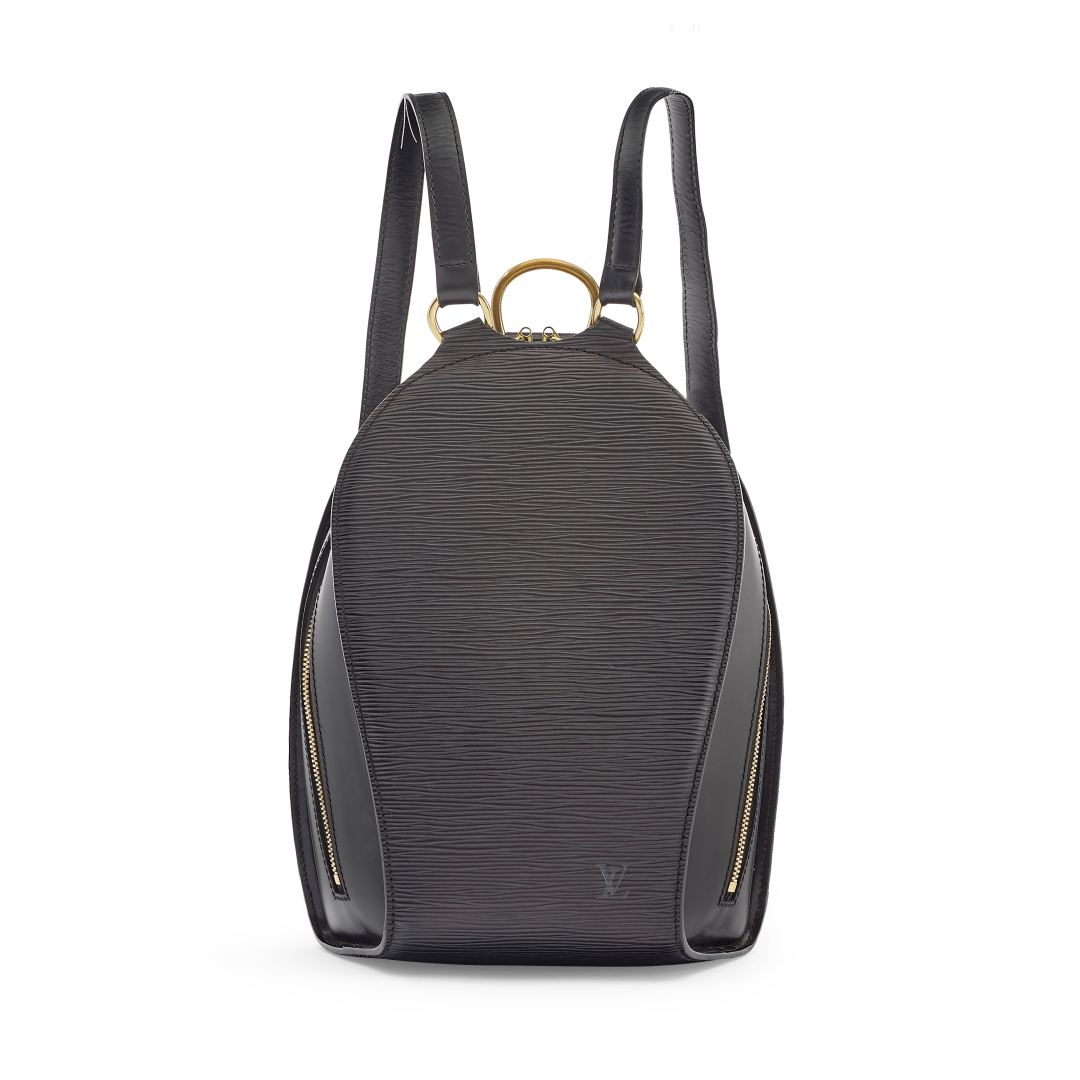 black Epi leather, black suede-textured textile lining. Double adjustable shoulder straps and smooth black leather trim. Two-way zip closure. One rear zip pocket. Golden-tone metal hardware.
