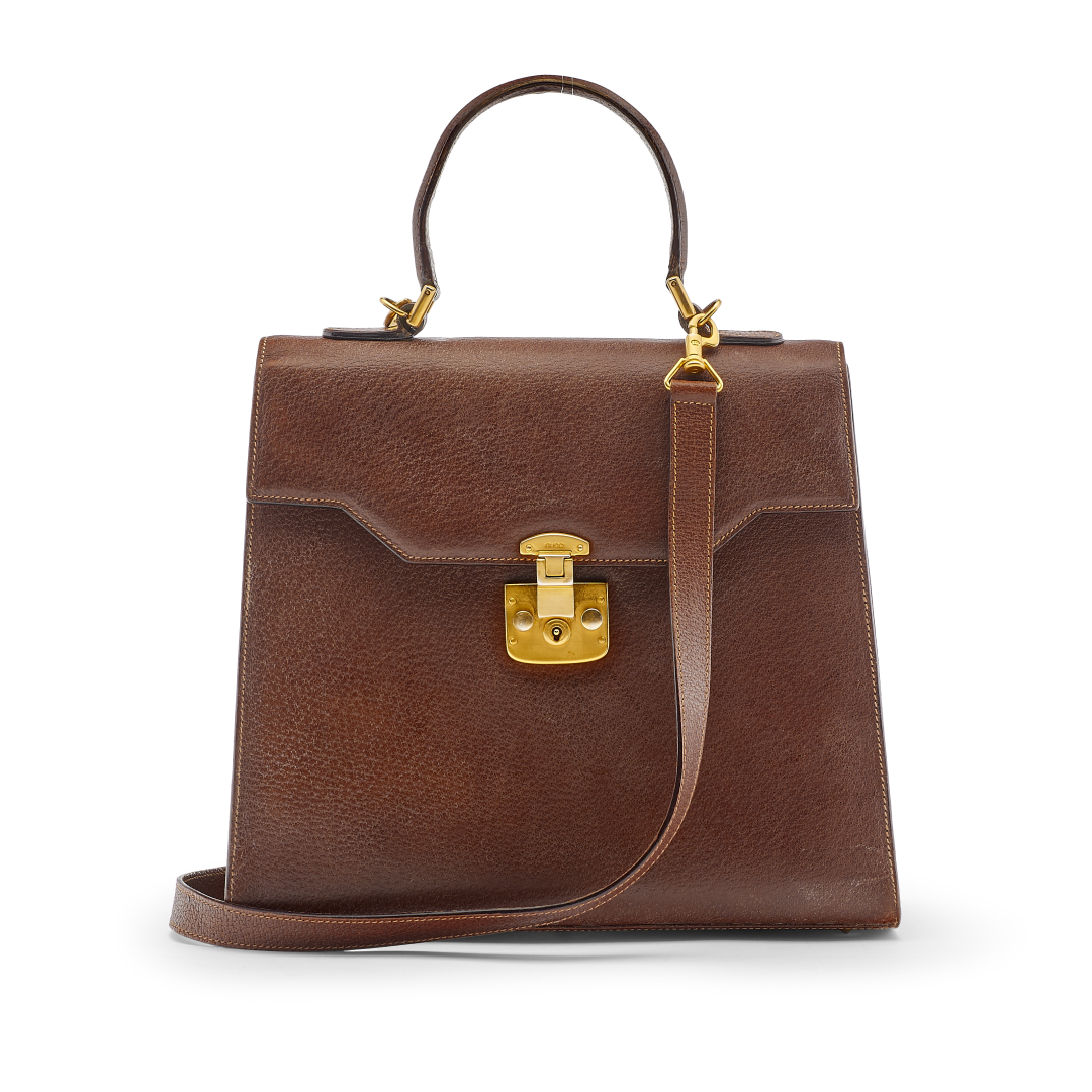brown boar leather, camel leather interior. Handle and detachable shoulder strap in brown leather. Flap closure secured by snap lock. Golden-tone metal hardware.