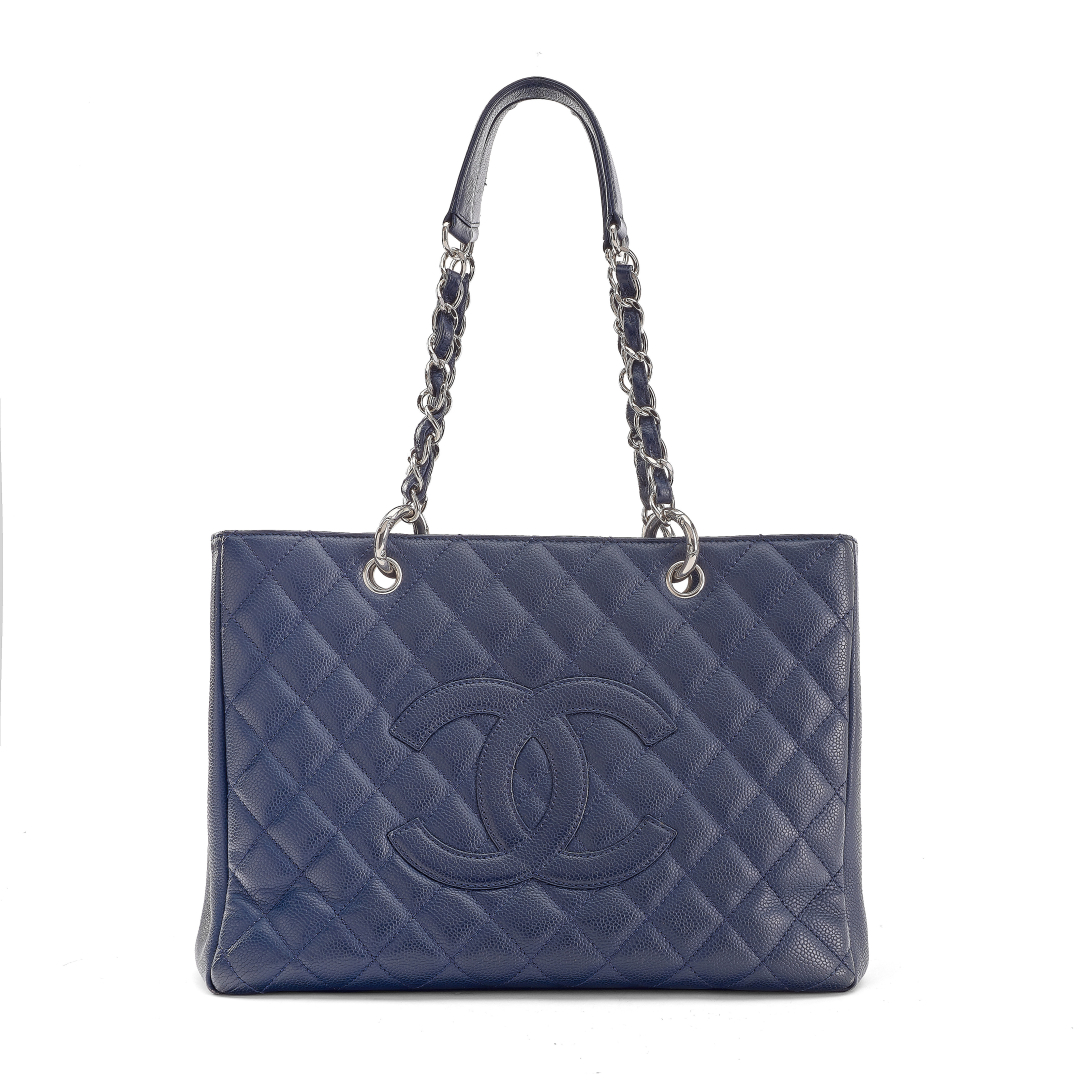 quilted blue Caviar, black grosgrain interior. Double chain handle with leather shoulder pad and interwoven leather. Three compartments, the central one with logo pull zip closure. Large front logo and rear flat pocket. Silver-tone metal hardware.