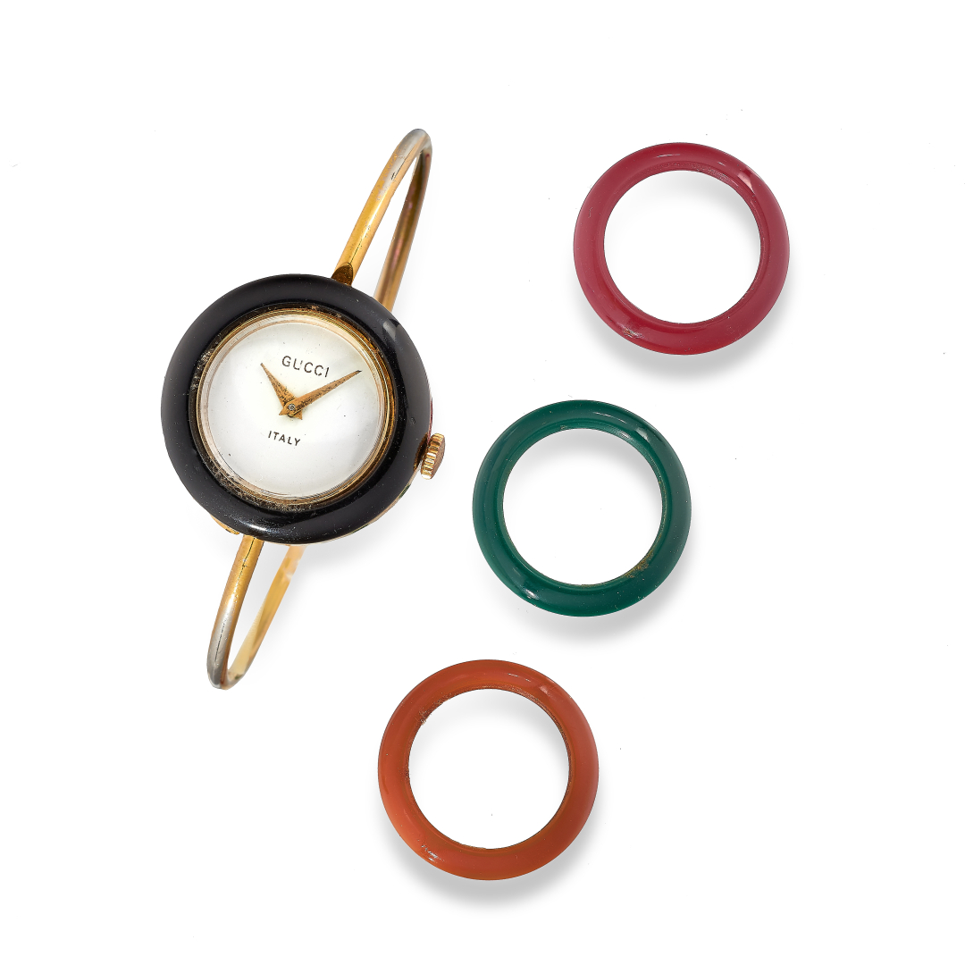 gilded metal, with four interchangeable multicolor acrylic bezels. Manual winding.
