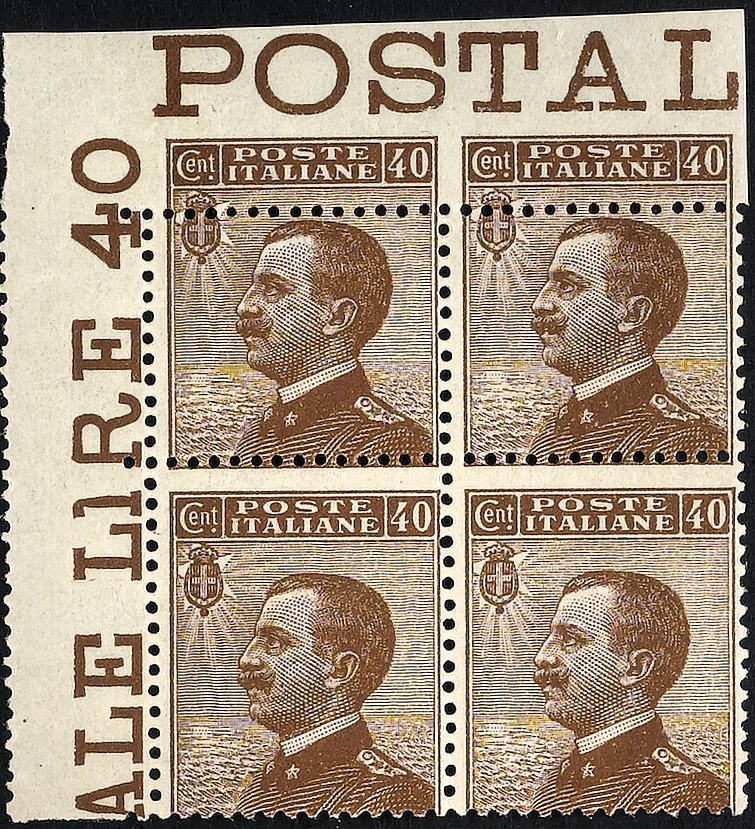 MICHETTI 40 C. BRUNO BLOCCO DI QUATTRO ANGOLO DI FOGLIO SUPERIORE SINISTRO CON DENTELLATURA IN ALTO FORTEMENTE SPOSTATA IN BASSO