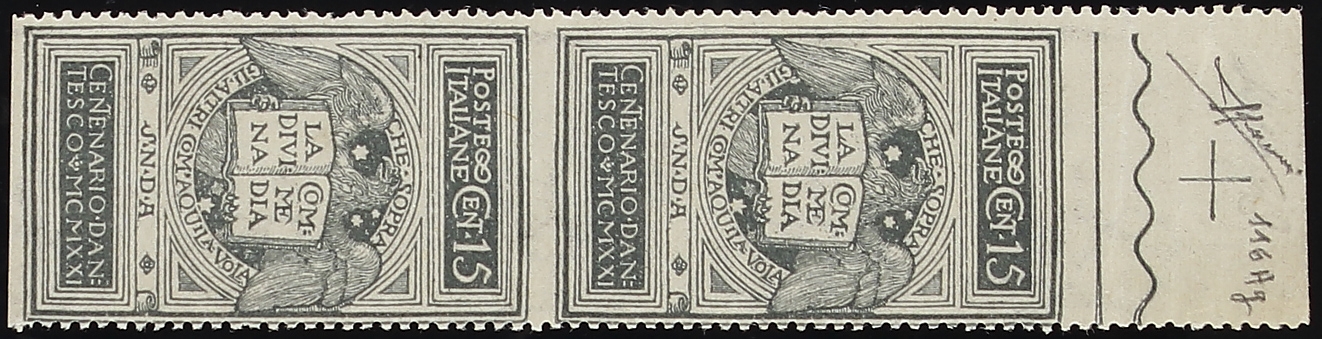 1921 - Dante Alighieri - 15c. grigio non emesso coppia verticale non dentellata orizzontalmente con bordo di foglio superiore - Cert. Sorani