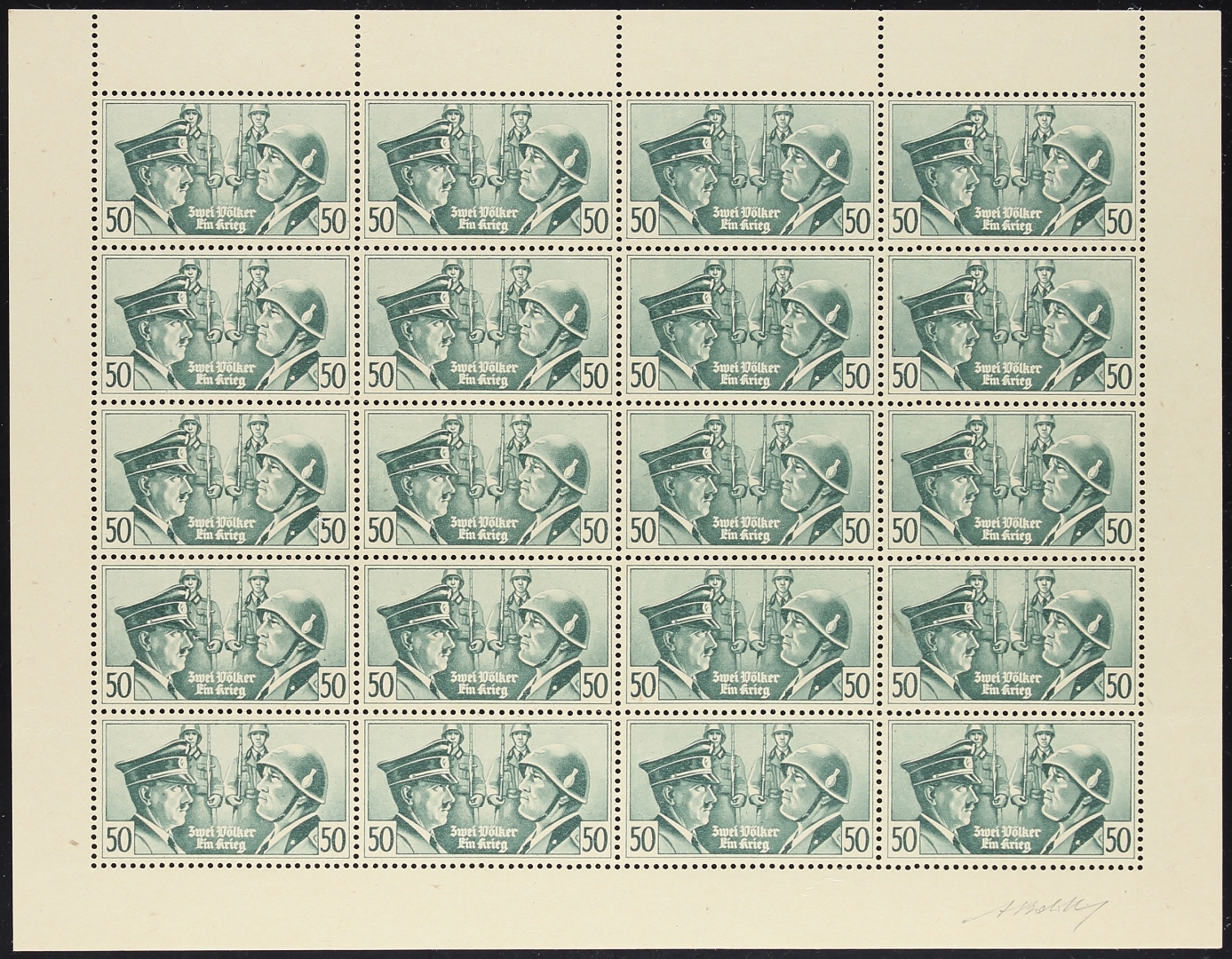 1941 - Asse - Falsi di guerra 50 c. - Il foglietto di 20 esemplari - Uniti i due valori singoli - Firma A. G. Bolaffi