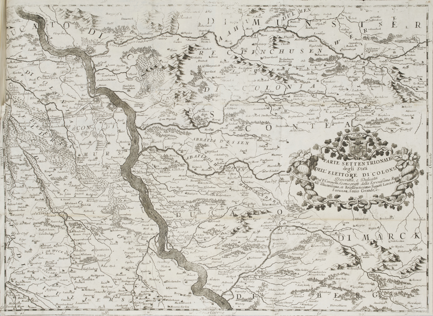 Bell'atlante di Coronelli che unisce la Germania e il rarissimo corso del Reno in complessivamente 152 carte, vedute e piante. Nessun passaggio in asta.