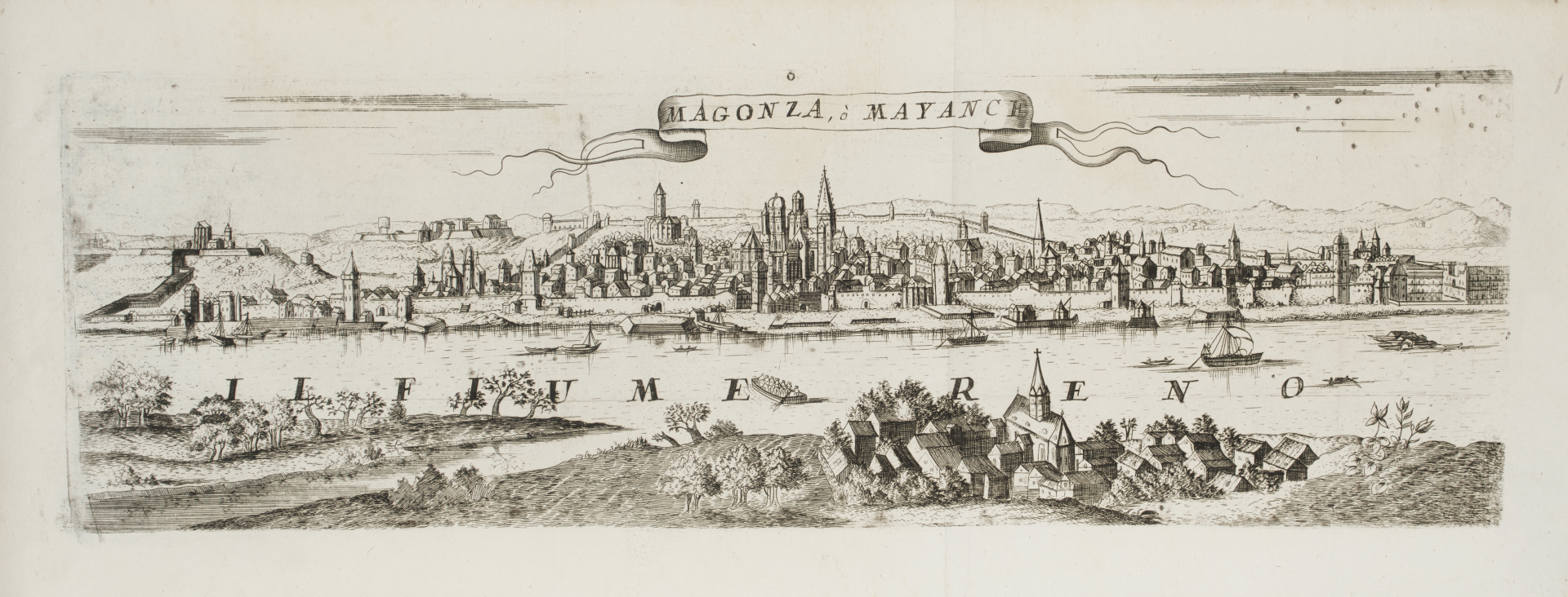 In 4° oblungo (195 x 272 mm); 2 parti in 1 volume. Germania: Occhietto, 80 carte, vedute e piante (rinforzo al margine bianco di poche vedute, macchia al margine bianco di una tavola); Il Reno: Frontespizio, e 72 carte, vedute e piante, in parte ripiegate, e di cui 9 grandi mappe geografiche ripiegate più volte, e 4 carta di testo (piccoli difetti.) Legatura coeva in mezzo vitellino con titolo in oro su tassello al dorso, tagli a spruzzo rosso (piccoli fori di tarlo al dorso).