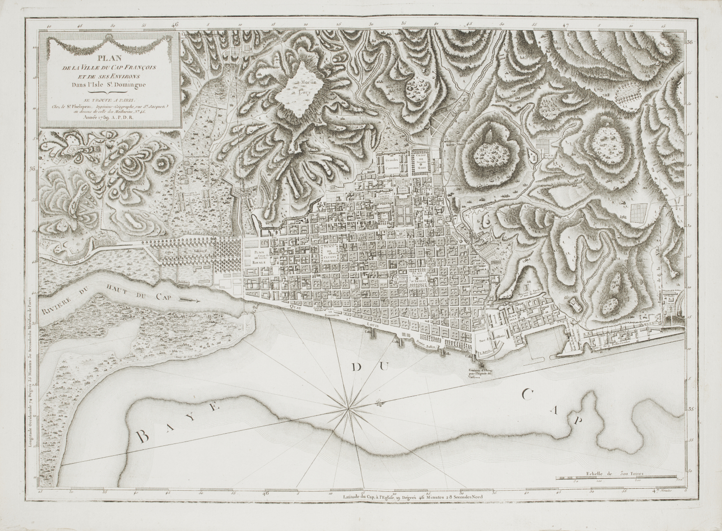Prima ed unica edizione della più stimata testimonianza geografica e cartografica sulla colonia francese di Santo Domingo poco prima della rivoluzione haitiana. Le tavole 1-14, che contengono 26 figure, sono disegnata da De la Brunière, Perignon e Ozanne ed incise da Ponce. Le rimanenti tavole, pubblicate da Phelipeau, sono tutte impresse su carta forte virata in azzurro.