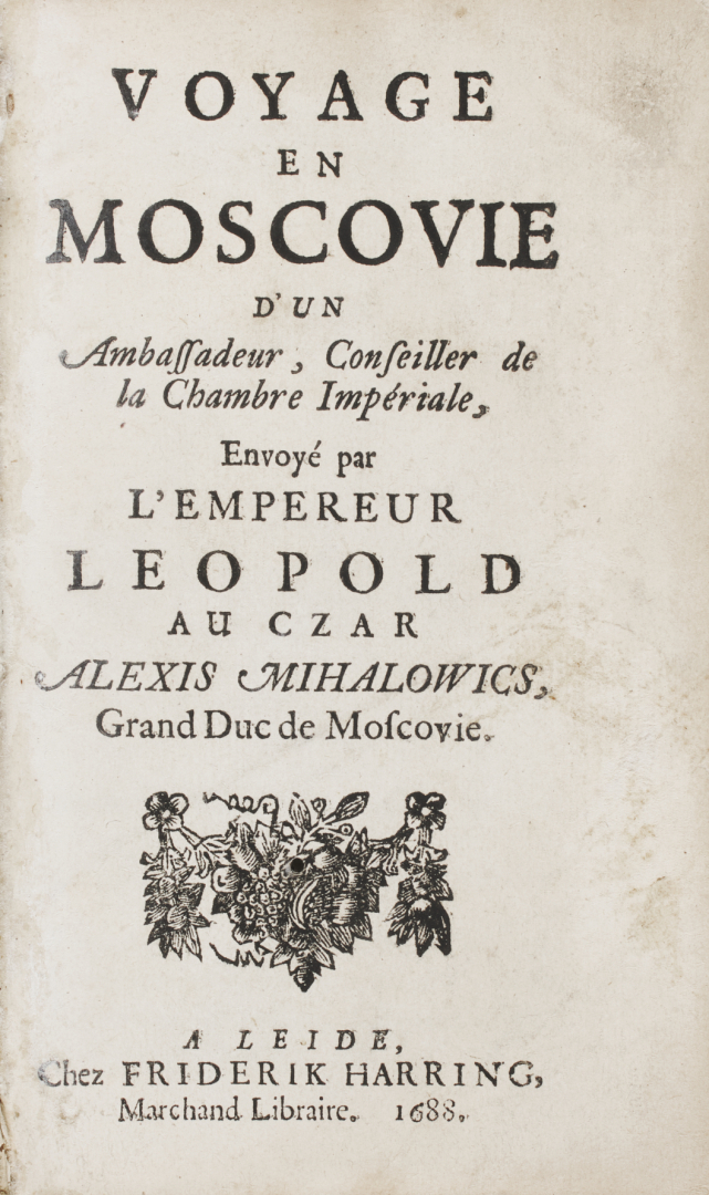 [Russia]. Russia [Russia] Prima edizione della traduzione francese del Voyage en Moscovie d'un Ambassadeur, Conseiller de la Chambre Impériale, envoyé par l'Empereur Leopold au Czar Alexis Mihalowics, Grand Duc de Moscovie di Baron August von Mayerberg del 1668, entro legatura coeva in pelle color nocciola con fregi e titolo su tassello al dorso. Si tratta di un viaggio effettuato tra il 1661 e il 1663 dal diplomatico tedesco von Mayerberg (1612-1688) su incarico dell'Imperatore Leopoldo d'Austria. Nel resoconto del viaggio, oltre alle considerazioni di carattere politico e militare, ve ne sono anche di interessanti riguardanti usi e costumi, feste popolari e l'alimentazione. Mayerberg fu ricevuto dallo Zar Alessio ed ebbe anche modo di assistere alla rivolta della popolazione moscovita del 4 agosto 1662.