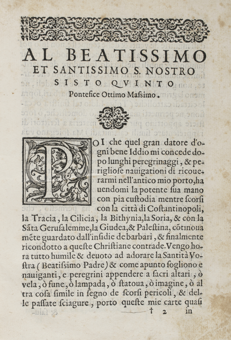Insolita prima edizione dell'opera del medico e storico italiano, che si recò in Siria al seguito del console della Serenissima Repubblica di Venezia e potè così scrivere un avvincente resoconto della guerra scoppiata nel 1578 tra il sultano Murad III e lo scià Mohammad Hodabanda il Cieco. Nel lotto anche Zosimi comitis et exaduocati fisci, Historiae nouae libri VI nell'edizione di Basilea di Peter Perna del 1576 circa entro legatura coeva in pergamena con decorazione a secco e tagli rossi, Gli stratagemi di Polieno del 1552 entro legatura in pergamena con titolo in oro su tassello al dorso liscio, tagli verdi, entro cofanetto.