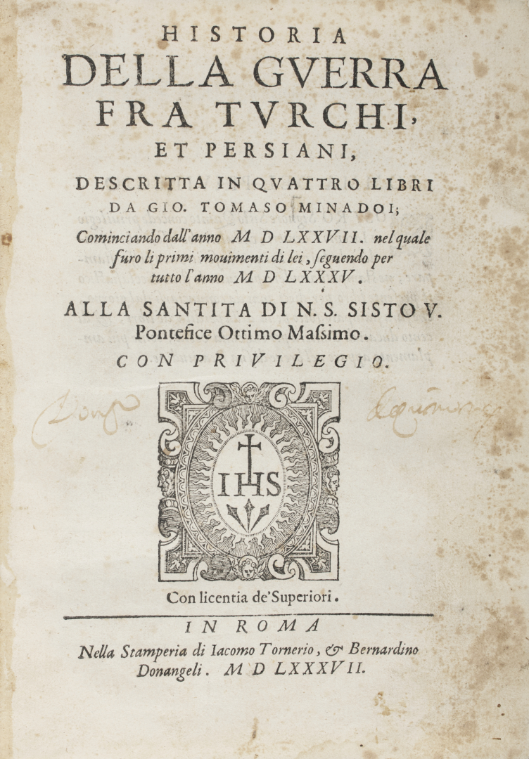 [Turchi]. Minadoi, Giovanni Tommaso. Historia della guerra fra Turchi et Persiani, descritta in quattro libri. Roma, Giacomo Tornieri e Bernardino Donangeli, 1587.