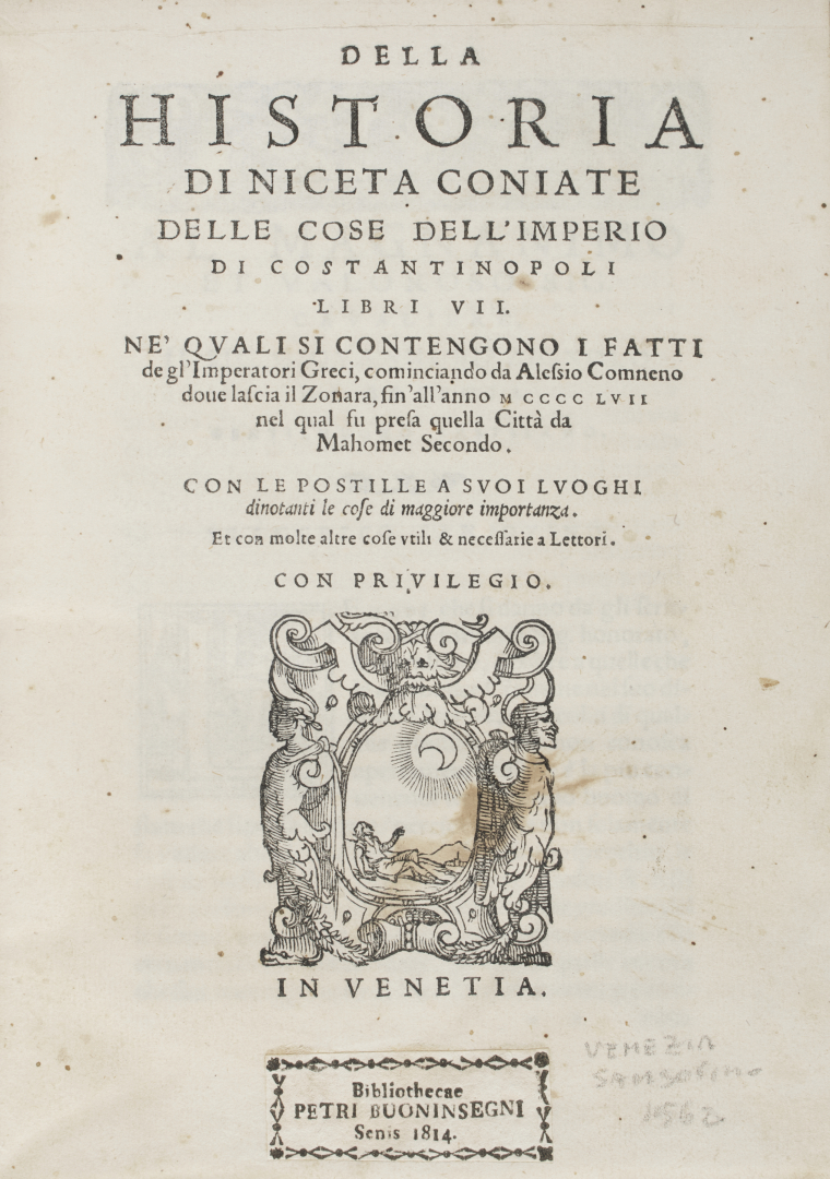 [Turchi]. Sansovino, Francesco , e Niceta Coniate. Della historia ... delle cose dell'imperio di Costantinopoli libri VII. Venezia, Francesco Sansovino, 1562.