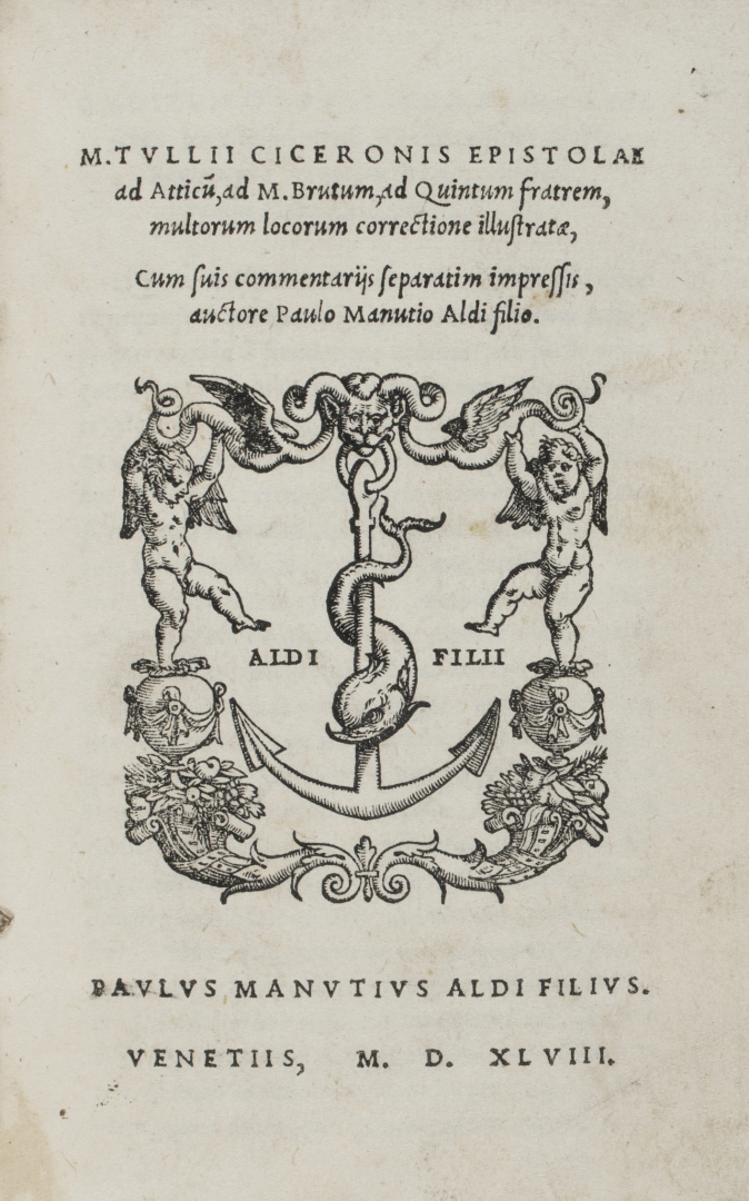 [Aldina - Classici]. Raro gruppo di edizioni di Cicerone stampate a Venezia dagli eredi di Aldo Manuzio, che include i 2 volumi M. Tullii Ciceronis De philosophia del 1546, entro legatura coeva in pergamena con unghiatura e tracce di bindelle; le Epistolae ad Atticum, ad M. Brutum, ad Quintum fratrem del 1548, in legatura pergamenacea con unghiatura e tracce di bindelle; Le Epistole famigliari, traduzione italiana di Guido Loglio del 1554; il primo volume della riedizione del 1555 di M. Tullii Ciceronis De philosophia, legato in mezza pergamena con titolo in oro su tassello al dorso e tagli rossi, e il Thesaurus Ciceronianus di Mario Nizzoli impresso nel 1591, fondamentale opera di consultazione.