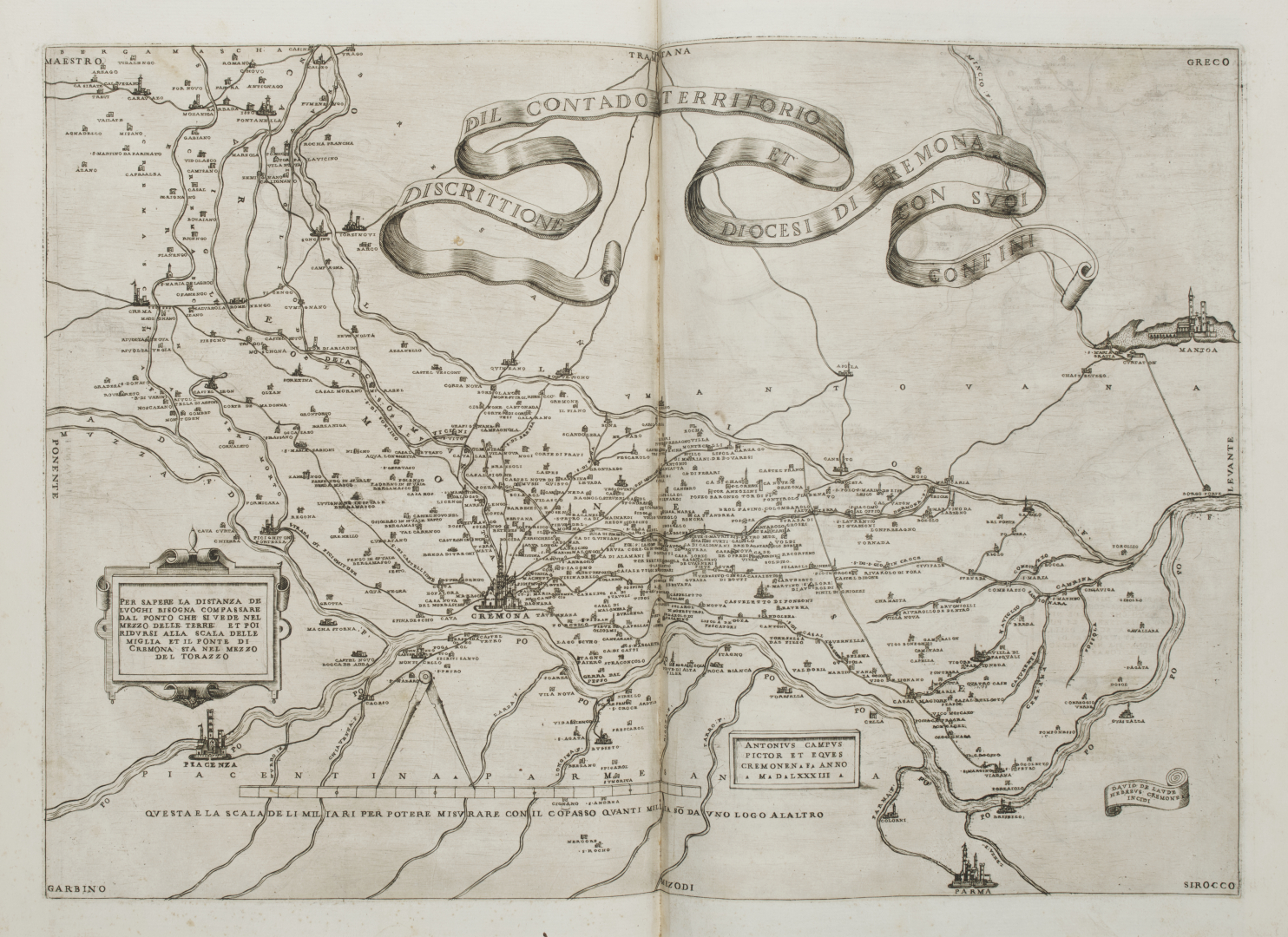 [Cremona e Milano]. Campo, Antonio. Cremona fedelissima citta, et nobilissima colonia de romani rappresentata in disegno col suo contado. Cremona, Ippolito Tromba e Ercoliano Bartoli, 1585.