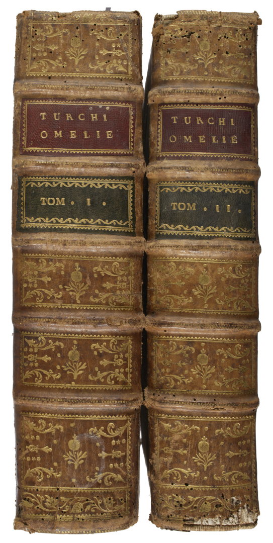 [Bodoni - Religione]. Interessante e inconsueto insieme di opere religiose, stampate presso la tipografia di Giambattista Bodoni, tra le quali si annoverano le rare Omelie e lettere pastorali di monsignore fr. Adeodato Turchi [1788-1802], in 2 volumi entro elegante rilegatura coeva in pelle spugnata (sciupata, con piccole mancanze alle cuffie), con triplice filettatura e fleurons angolari ai piatti, fregi fitomorfi e titolo su doppio tassello in oro al dorso, unghiatura, labbri e tagli dorati; Istruzione cristiana ad un giovinetto cavaliere e a due giovinette dame, scritta dall'abate gesuita Giovanni Battista Roberti e pubblicata nel 1787; Su la celebrazione della Pasqua ... dichiarazione popolare di Pietro Cossali, del 1802; Il Saggio analitico sulla compassione di Ubaldo Cassina, professore di Filosofia morale, edito nel 1772 e Il Cantico de' cantici trasposto in versi da Evasio Leone e stampato a Parma "co' tipi bodoniani" nel 1800. Nel lotto sono inoltre compresi altri libri antichi di argomento religioso, tra cui Il trafficante celeste ... huomo buono, il santo, cittadino cremonese del 1674 e La prima [-quarta] parte dell'oratione et meditatione per li giorni della settimana, volume che racchiude in legatura coeva in pergamena le quattro sezioni dell'opera di Luis de Granada, stampata per i tipi di Giorgio Angelieri a Venezia nel 1582.